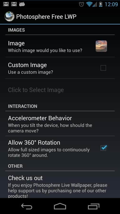 Fondo de pantalla en vivo de fotosfera - fondo de pantalla en vivo del mejor desarrollador para Android por Kittehface Software. Crea tus fotos favoritas o imágenes de la galería de la fotosfera. La aplicación te da la oportunidad de ver la imagen en 360 grados. Para rotar la cámara, utiliza gestos hacia la derecha o hacia la izquierda, y tampoco olvides el acelerómetro.