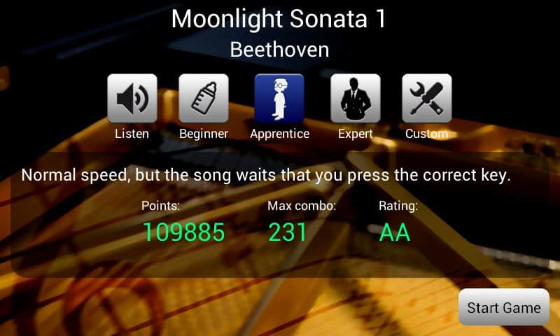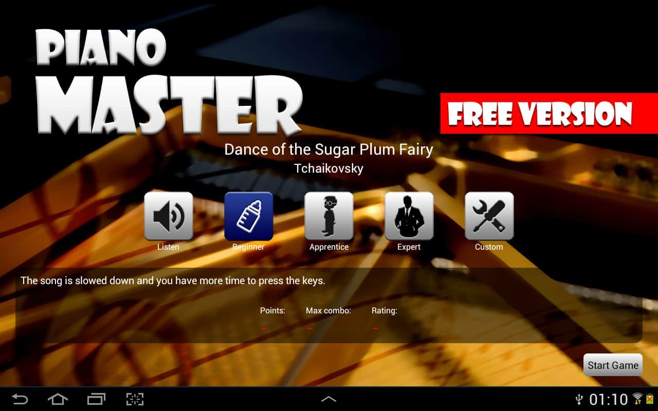 Piano Master es una gran oportunidad para aprender a tocar el piano en tu smartphone o tableta Android. El entrenamiento es muy divertido, hay una elección de dificultad, por lo que es adecuado tanto para niños como para adultos. Piano Master incluye obras de autores clásicos de música, como Chopin, Bach, Beethoven. Así como un gran número de melodías populares.