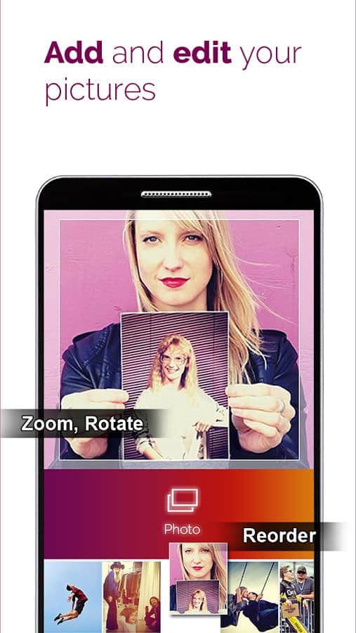 PicMotion - la presentación de video es un gran programa que permite crear videos de manera bastante simple con tu música favorita, fotos e incluso tu propia voz. En otras palabras, crea una presentación de diapositivas en video (Instagram, Vine, Youtube). La aplicación tiene una serie de funciones útiles, como edición de fotos, grabación de voz, establecer el tiempo para comenzar la canción y la duración de la visualización de cada imagen, y muchas más.