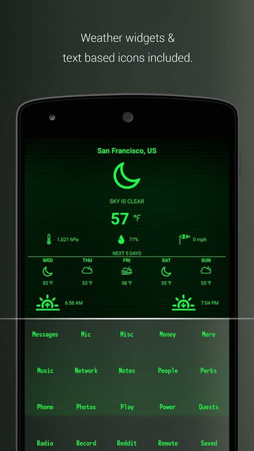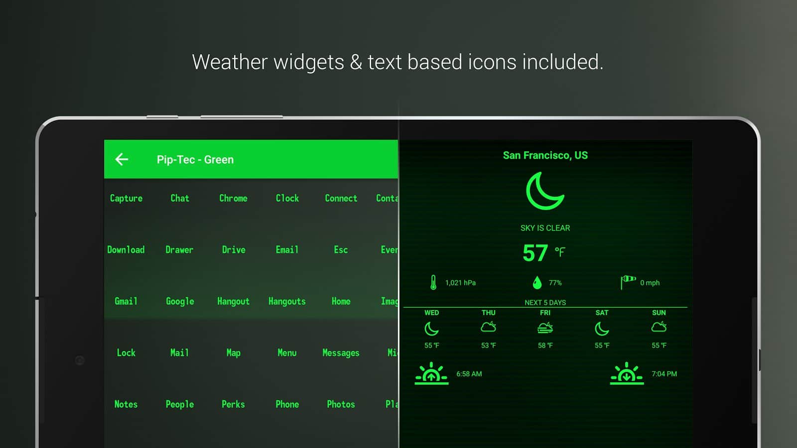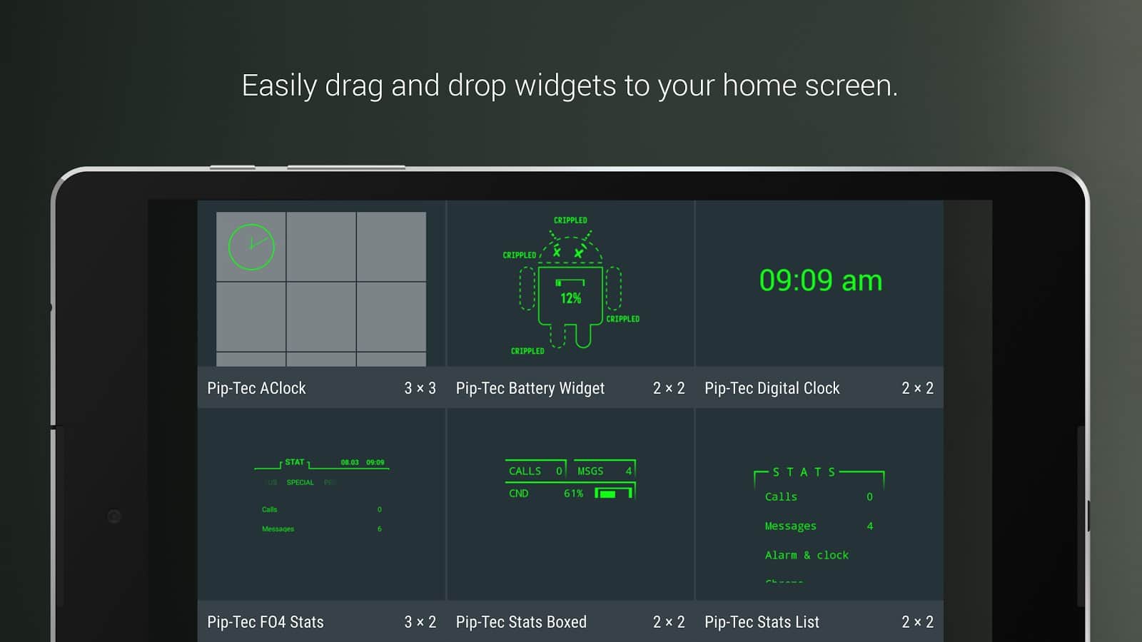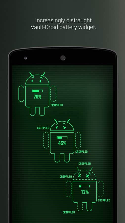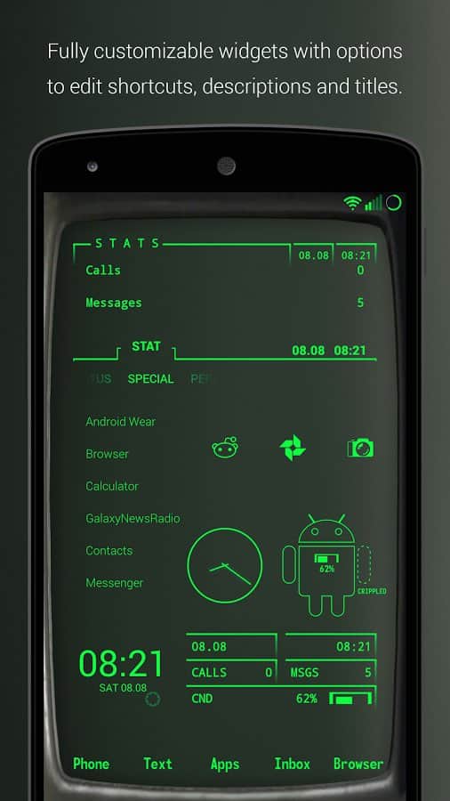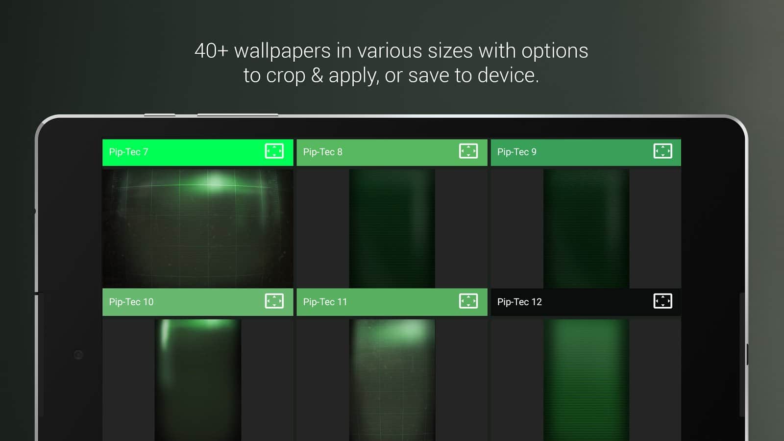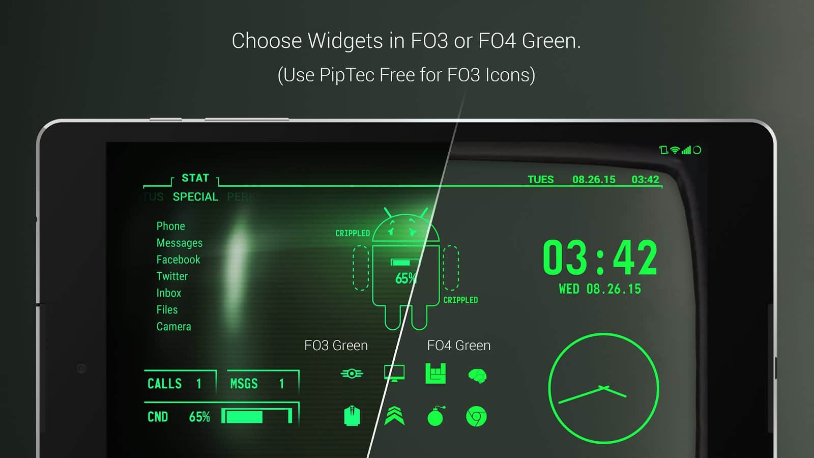 PipTec Iconos Verdes & Pared en Vivo - Esta aplicación hará que tu dispositivo android sea un verdadero pip boy. El diseño se realiza en las mejores tradiciones de FallOut. La aplicación es fácil de configurar y puedes cambiarlo todo. No necesitas revolver en un montón de configuraciones, todos los íconos, cambiar el tamaño de los widgets y mucho más, puedes cambiarlo simplemente separando o manteniendo los dedos. Todos los tamaños se configuran directamente en la pantalla de tu dispositivo. Luego, solo tienes que guardar, y voilá, tu único pip boy está listo para trabajar. Si eres un verdadero conocedor de FallOut, entonces esta aplicación te ayudará a sumergirte en su atmósfera, pero en la vida real.
