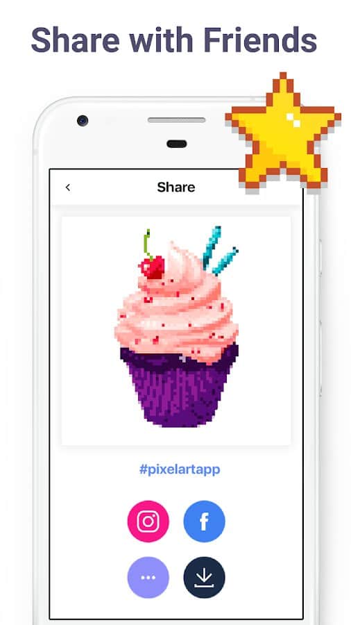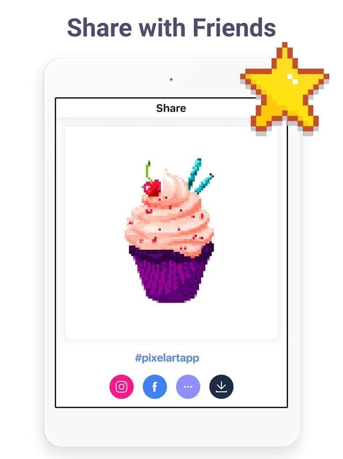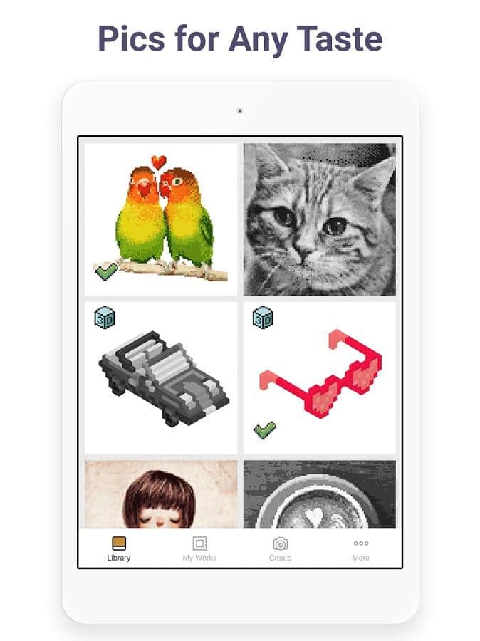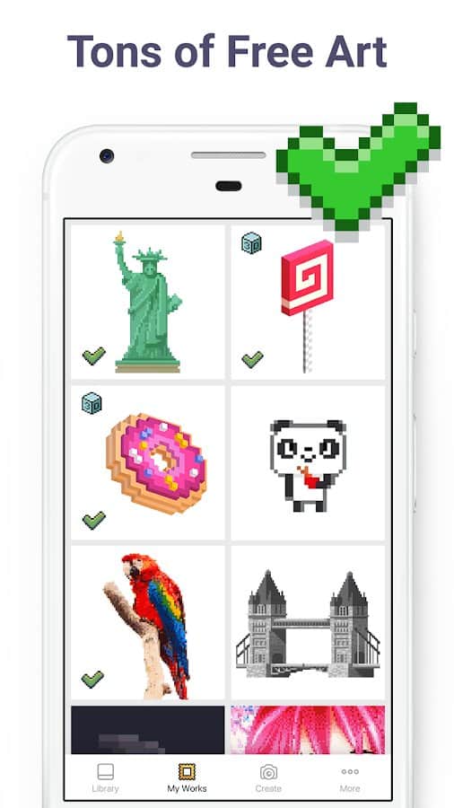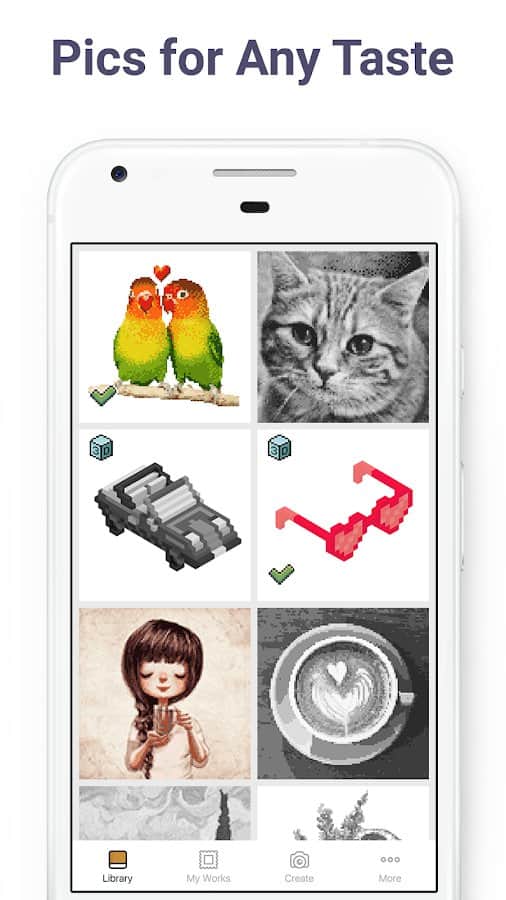 El arte en píxeles tiene el potencial de complacer no solo a los niños, sino también a los adultos. La aplicación ofrece una gran selección de imágenes en píxeles que deseas pintar por números. Para los niños, hay imágenes con criaturas mágicas, dulces, animales adorables y juguetes, mientras que a los adultos les pueden interesar los patrones más complicados: con diseños, flores, edificios, personas. Si le das a la aplicación acceso a la cámara, puedes subir tu propio selfie u otras imágenes, y luego pintarlas.