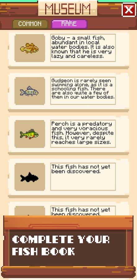 Completa tu libro de peces rastreando cada criatura atrapada. Desarrolla tus habilidades y desbloquea una variedad de peces de colores.