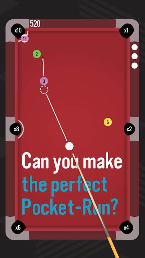 Pocket Run Pool – juego clásico de billar para Android en el que podrás jugar contra la computadora o jugadores de todo el mundo. Juega tu juego favorito en cualquier momento libre y entrena tus habilidades. Con la ayuda del taco, empuja las bolas hacia los agujeros y acumula suficientes puntos. Por cada jugada exitosa perderás una vida, así que intenta terminar el juego hasta que se te acaben los movimientos. Compite contra jugadores de todo el mundo y logra grandes resultados subiendo lo más alto posible en la tabla de clasificación. Los jugadores del juego apreciarán los controles simples e intuitivos, los bonitos gráficos y la jugabilidad entretenida.