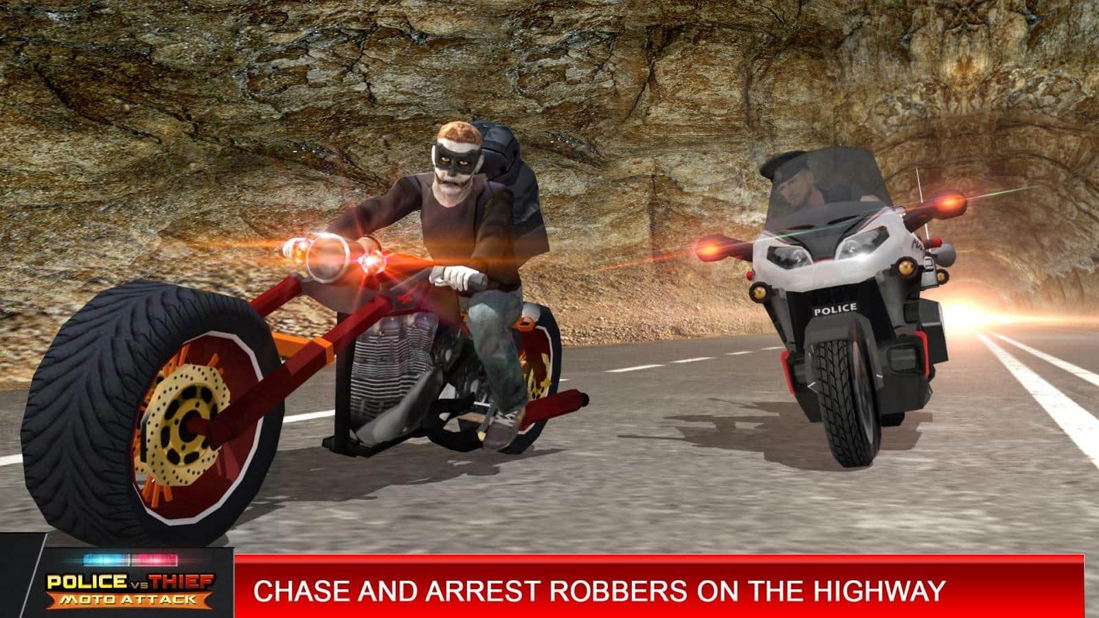 MotoAtaque Policía vs Ladrón - En este juego jugarás el papel de un POLICÍA que persigue a una pandilla de ladrones. La pandilla se mueve por la carretera en motocicletas y furgonetas. ¡Tu tarea será alcanzar a todos los miembros de la pandilla y arrestarlos!