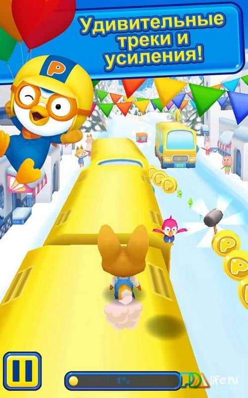Pororo Penguin Run - un corredor en el que tu héroe de la serie animada Pororo correrá y recogerá bonificaciones. Controla a tu corredor, esquiva obstáculos y recoge monedas y estrellas que te ayudarán a desbloquear niveles adicionales y bonificaciones especiales. Corre por diferentes lugares, desde ciudades nevadas hasta castillos de hielo. Completa diversas misiones que se te dan cada día y recibe recompensas adicionales.