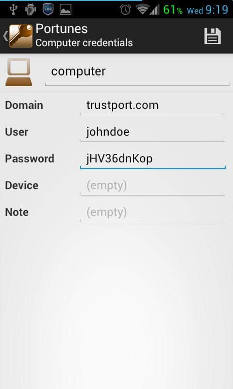 Portunes es un gran programa para Android para almacenar información sensible (códigos PIN, tarjetas, contraseñas, etc...) del desarrollador TrustPort, a.s. Toda la información estará encriptada y protegida por contraseña contra hackers y virus, y los datos se sincronizan con el dispositivo móvil a través del servicio en la nube. Ahora olvidar o perder información confidencial sería imposible. La aplicación te dará una opción de contraseña de seguridad, ya sea por longitud, números o caracteres especiales.