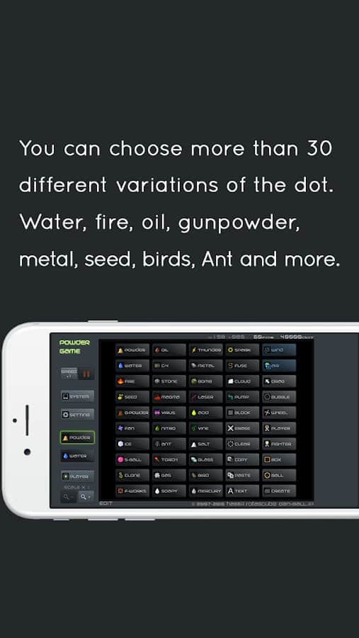 Juego de Polvo - Los procesos realistas creados por la naturaleza misma realmente asombran con los resultados físicos de la interacción de varios objetos. Tu colección incluirá los recursos más básicos o fenómenos físicos que se pueden combinar para observar las consecuencias: fuego, agua, pólvora, pájaros, hormigas, viento, aceite, metal, semillas, trueno, polvo, hielo, sal, mercurio, jabón, fuegos artificiales y mucho más. Puedes crear, copiar, limpiar o pegar ciertos datos para lograr el mismo resultado nuevamente.