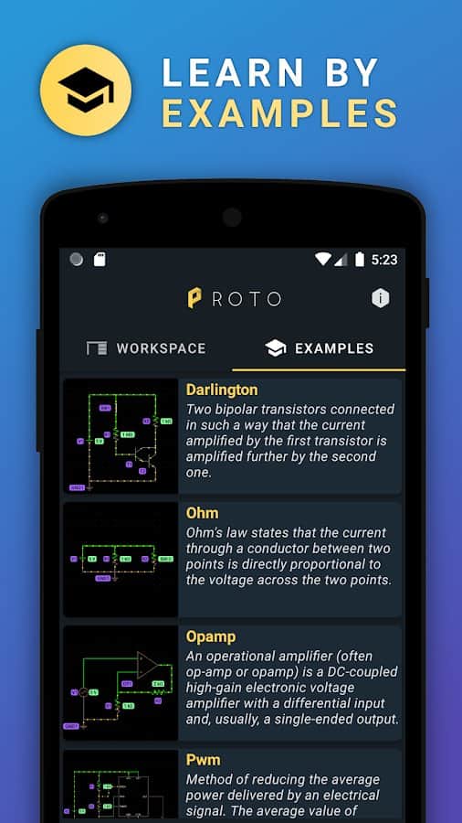 - Estudio de circuitos electrónicos utilizando ejemplos en la aplicación