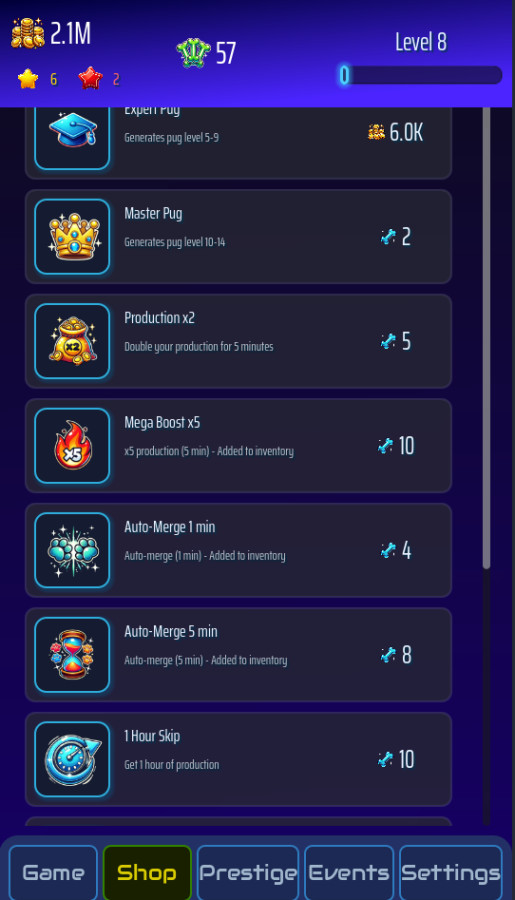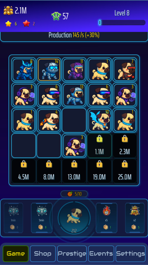 PugRace Evolution es un encantador juego casual del género idle + merge, donde puedes combinar adorables pugs y ver cómo evolucionan en nuevas y divertidas formas. Comenzando con un simple cachorro, desbloquearás 15 niveles únicos de evolución y crearás tu propio imperio de pugs. Las mascotas seguirán ganando monedas incluso cuando estés desconectado, y te esperan misiones diarias, recompensas y un sistema de prestigio. ¡Desarrolla el tablero, desbloquea nuevos espacios y conviértete en el entrenador principal de la evolución de los pugs!