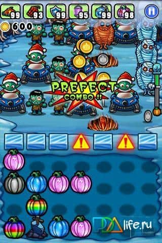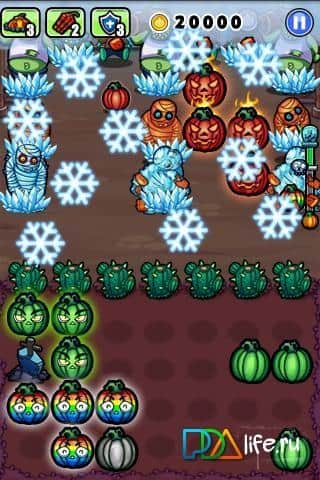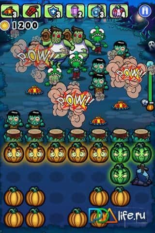 Calabazas vs. Monstruos - divertido juego de arcade sobre un zombi - cultivarás una cosecha de calabazas y luego lanzarás esas calabazas a los zombis que se acercan. Así que, combina 3 calabazas del mismo color y luego lánzala a un monstruo. Las calabazas se pueden mover para alinear 3 calabazas de uno de los colores: verde, rojo y naranja. Y si una calabaza te detiene, ¡haz clic en ella 2 veces y se romperá! En el lugar de los zombis muertos aparecerán monedas y bonificaciones en forma de habilidades especiales. Y con las monedas ganadas, en la tienda puedes encontrar muchas cosas útiles para luchar contra los monstruos. El juego tiene 2 modos: aventura, que consta de 45 niveles, y el modo infinito que te permite disfrutar de la destrucción de zombis como desees.