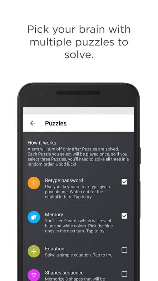 Despertador de Rompecabezas - ¿No puedo despertarme normalmente por la mañana? ¡No hay problema, con esta aplicación no tendrás opción! A menos que decidas desarmar tu dispositivo y quitar la batería. Pero si decides desactivar la alarma, tendrás que pensar bastante en lo que hará que tu cerebro se despierte. Aquí encontrarás una interfaz simple e intuitiva, con múltiples funciones. Por supuesto, la función principal de este despertador, ¡pero quién dijo que no puedes poner un pequeño juego para activarlo! Sí, exactamente, resolverás matemáticas o recordarás dónde están los rectángulos azules y luego los seleccionarás, y mucho más. Rompecabezas por la mañana, es un cerebro somnoliento.