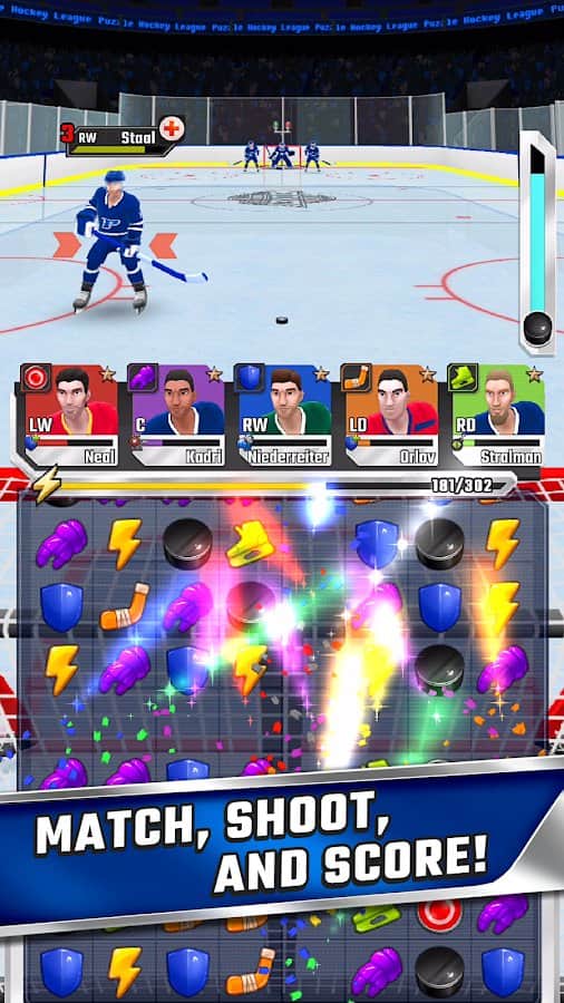 Puzzle Hockey – un juego de deportes en Android donde jugarás hockey. En este juego, tu tarea principal será reunir tu equipo imbatible de jugadores de renombre y ganar campeonatos. Aplica su lógica y desarrolla tácticas imbatibles que demuestren ser útiles en el hielo. Combina palos, cascos, discos y otros objetos y ten la ventaja sobre los rivales. Una combinación exitosa de los elementos sugeridos te permitirá marcar goles con éxito en la portería del oponente o defender a tu maestro de un ataque. Gana el campeonato y obtén valiosos premios.