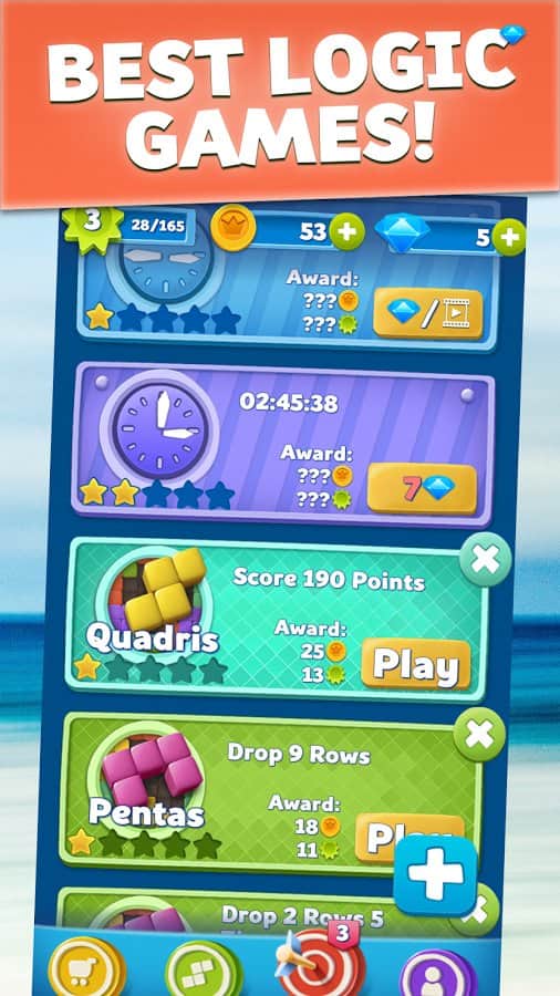 Puzzle Masters (6 en 1) – un fascinante rompecabezas para Android, que ha absorbido muchos juegos en el estilo de Tetris y juegos del género de tres en línea. En este juego primero tendrás disponibles dos juegos que puedes jugar y acumular suficientes puntos y logros para desbloquear el siguiente. Juega este juego y desarrolla tus habilidades mentales e intelectuales, tratando de realizar todas las tareas y establecer tu puntuación más alta en este juego. Colecciona cristales y disfruta de las tareas y misiones que cambian constantemente. Con cada nuevo nivel que desbloquees, la dificultad del juego aumentará gradualmente y tendrás que trabajar duro para pasar todos los niveles.
