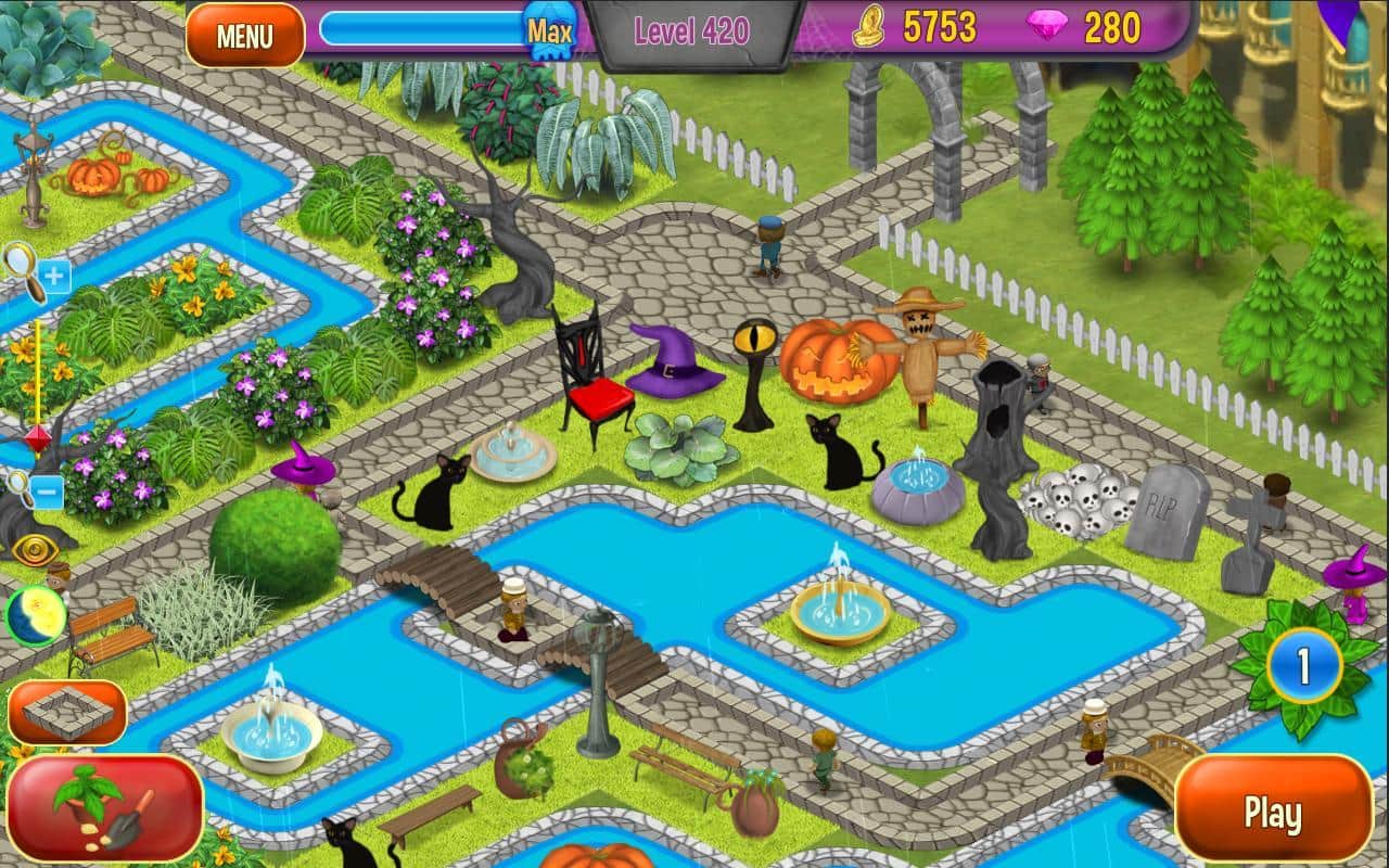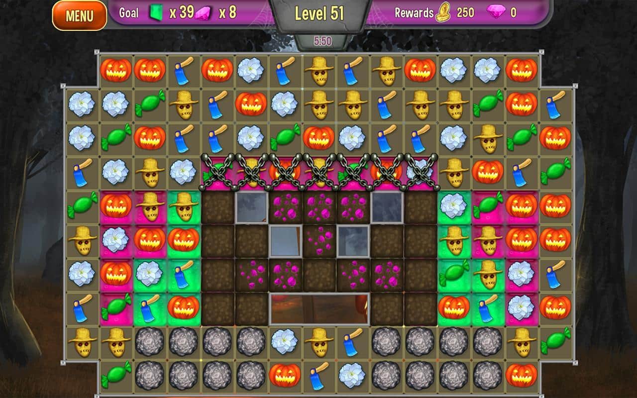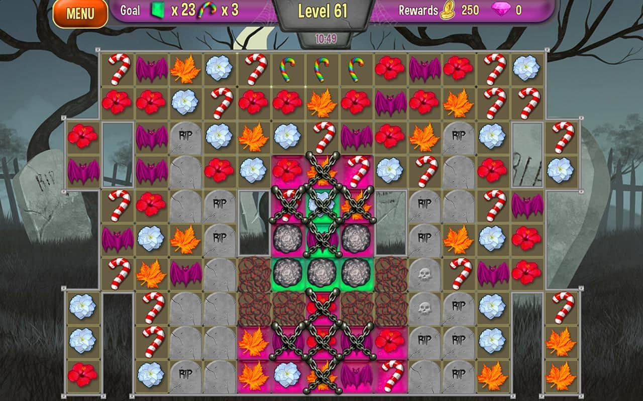 El Jardín de la Reina 3: Halloween – un emocionante juego del género tres en raya para Android con estilo de Halloween. Se acerca el momento de celebrar Halloween, y la Reina quiere decorar su jardín y necesita tu ayuda para ello. Combina tres o más objetos y enemigos en el juego. Recoge joyas especiales y compra plantas y decoraciones para el jardín. Crea composiciones únicas en tu jardín y supera más de 130 niveles del juego. Este juego deleitará a los jugadores con varios objetos en el juego y una atmósfera única y sombría.