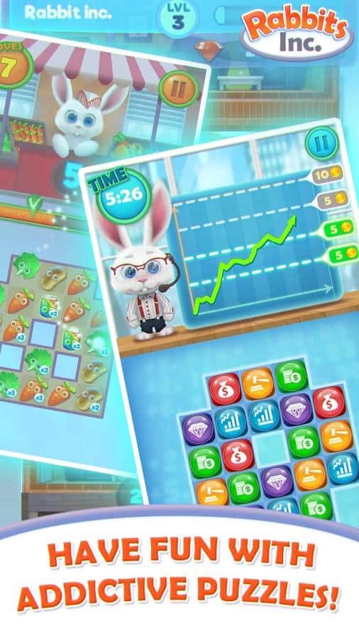 Rabbits Inc. es una corporación que fue fundada por un pequeño pero muy decidido conejito. ¡Su sueño era construir una nave espacial y viajar a las estrellas, y con esta corporación tiene que hacerlo! Tu tarea es muy simple, necesitas construir oficinas, contratar trabajadores y tratar de hacer que trabajen. No será una tarea tan fácil, porque cada empleado tiene sus propios parámetros e incluso tiempo de sueño. Al llevar a cabo pedidos, obtendrás nuevos niveles y dinero para desarrollar la empresa.