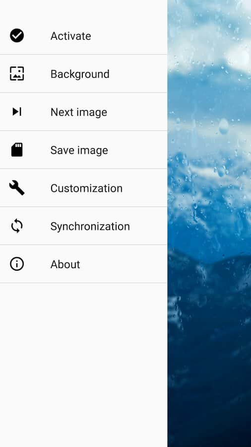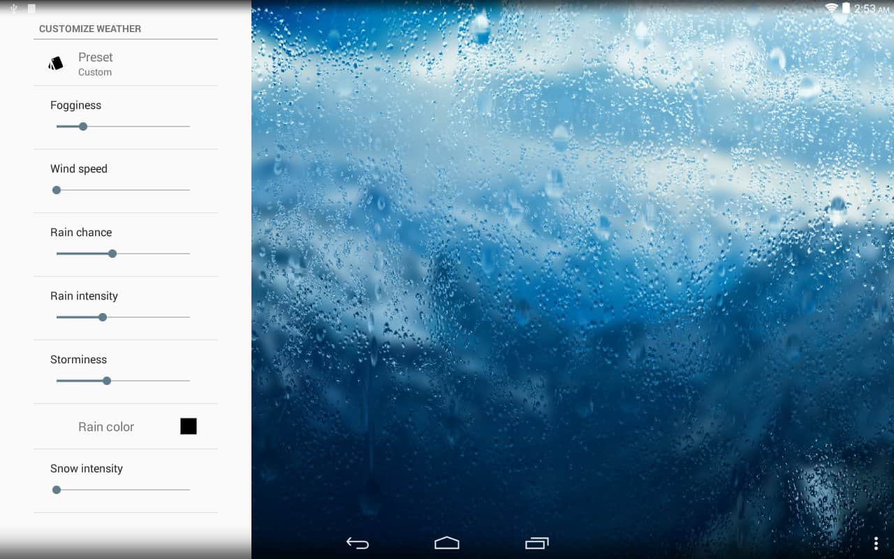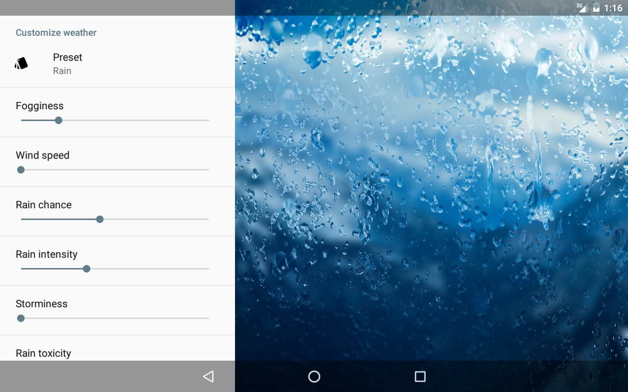Rainpaper - este fondo de pantalla en vivo ganó rápidamente popularidad, y todo gracias a su calidad. Su esencia es que pretende ofrecerte lluvia de la manera más precisa y realista posible. Puedes ajustar la lluvia como desees. ¡Puedes cambiar la frecuencia, la fuerza del viento, el tamaño de las gotas e incluso el color de la lluvia! ¿Quieres una lluvia roja sangre? ¡Fácil! Con esta aplicación todo es posible. Esta aplicación es muy fácil de configurar, y podrás disfrutar de lluvia eterna en la pantalla de tu smartphone.
