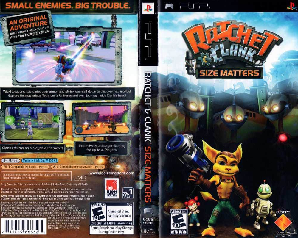Ratchet & Clank: Size Matters es un emocionante capítulo en la legendaria serie que llegó por primera vez a la PSP, no inferior a sus hermanos de consola en nada. Ratchet y Clank, un dúo inseparable, se embarcan en otra emocionante aventura en este plataformas en 3D, revelando los secretos de los Technomites - una increíble raza de ingeniosos inventores que decidieron crear un ejército de clones. En este juego, encontrarás un extenso arsenal de armas mejorables, incluyendo los icónicos Agentes del Destino, Hypershot y una Pistola de Succión para conquistar a tus enemigos.