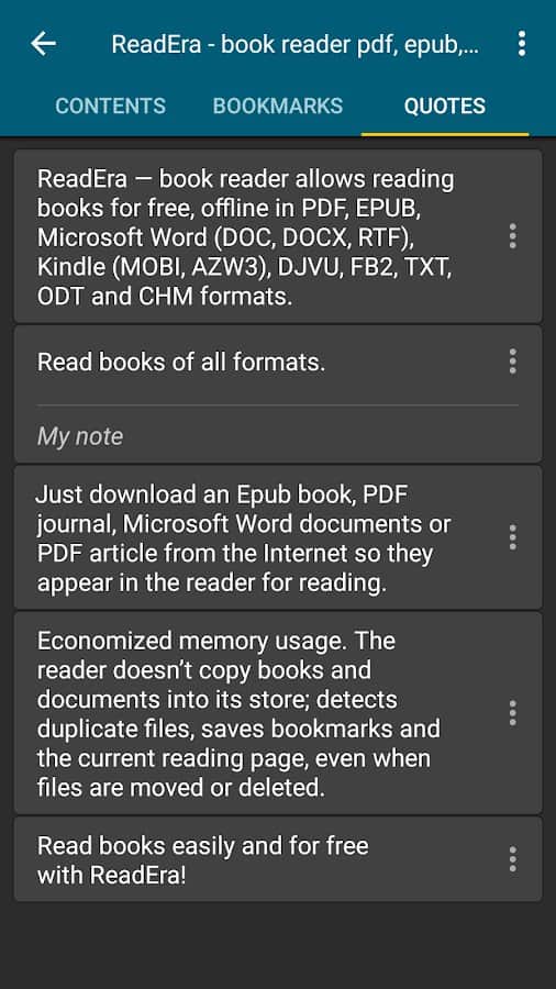 & lt;p & gt; La aplicación ReadEra te permite leer los formatos de e-book más populares de forma gratuita y sin conexión a la red: FB2, PDF, EPUB, Microsoft Word, DJVU, Kindle (MOBI, AZW3), TXT, ODT y CHM.
