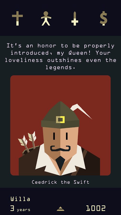 Reigns: Su Majestad – la tan esperada secuela del juego de cartas, donde estarás involucrado en intrigas de palacio. En este juego te encontrarás en el Reino, donde el gobierno es dirigido por una benevolente Reina. Está rodeada por todos lados por enemigos y súbditos codiciosos y envidiosos, que tramitan sus maquinaciones contra la Reina. Tu tarea será engañar a todos sus enemigos y aplicar un inventario místico. Resuelve complejos problemas públicos, presionándolo hacia el lado izquierdo de la pantalla a la derecha. Mantén el equilibrio entre las poderosas fuerzas del Reino y descubre relaciones personales y políticas, utilizando varios objetos del inventario. Tus acciones y órdenes en la línea afectarán el tiempo pasado en el trono y el futuro de tu dinastía.
