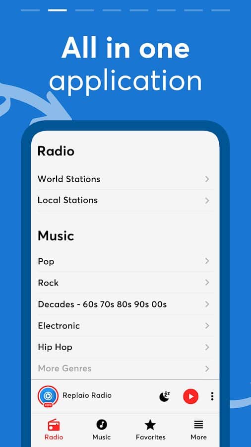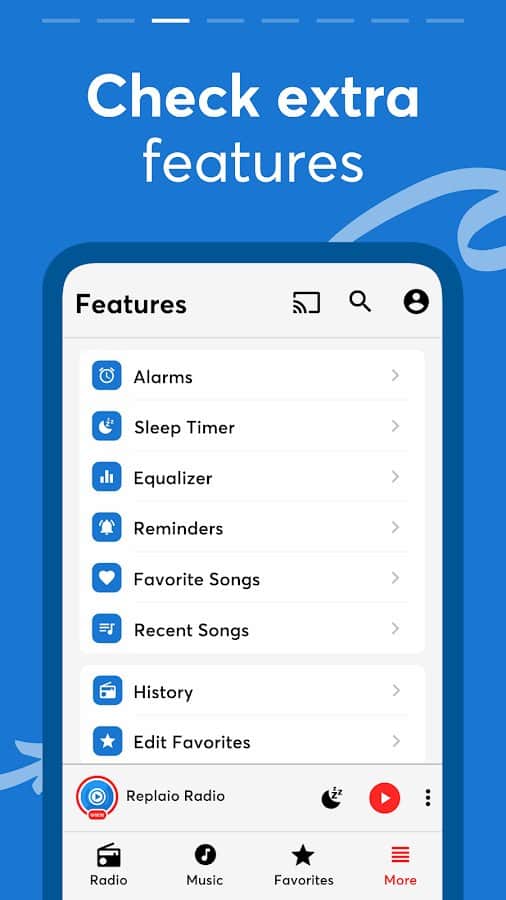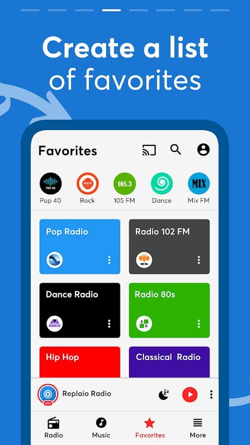 Replaio: Radio FM & Música en Vivo - Más de 50,000 estaciones de radio diferentes de todo el mundo se reúnen en un solo lugar, y cualquiera que quiera escuchar música en idiomas extranjeros puede abrir cualquiera de las estaciones de radio y disfrutar del sonido de canciones en estilos específicos. En la aplicación, tienes la oportunidad de establecer recordatorios sobre el inicio de programas seleccionados, un temporizador para dormir, una alarma con repetición automática después de un período específico de tiempo y, por supuesto, un ecualizador con autoajuste. Haz una lista completa de tus canciones favoritas y escucha constantemente las estaciones de radio que más te gustan.