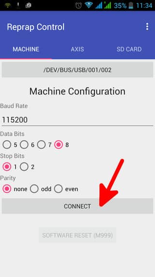 Reprap Control - Esta aplicación es una interfaz simple que controlará tu impresora 3D. Esta aplicación es un emisor de G-code con una interfaz gráfica de usuario para el control manual de tu impresora 3D. Compatibilidad con el módulo Bluetooth HC-05, HC-06. Configuración de comunicación - 1200~250000 Bits de datos: 5, 6, 7 u 8 Bits de parada 1 o 2 Bits de paridad: Ninguno, Par o impar