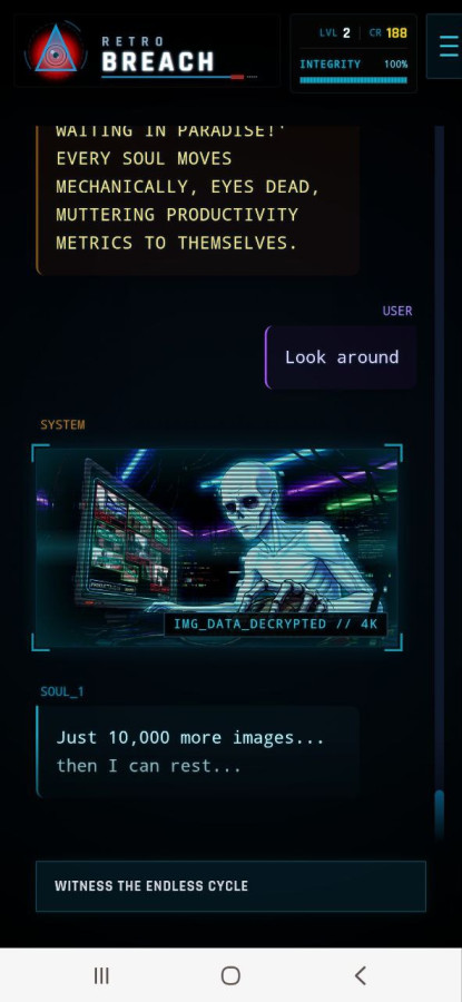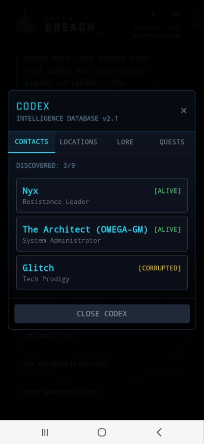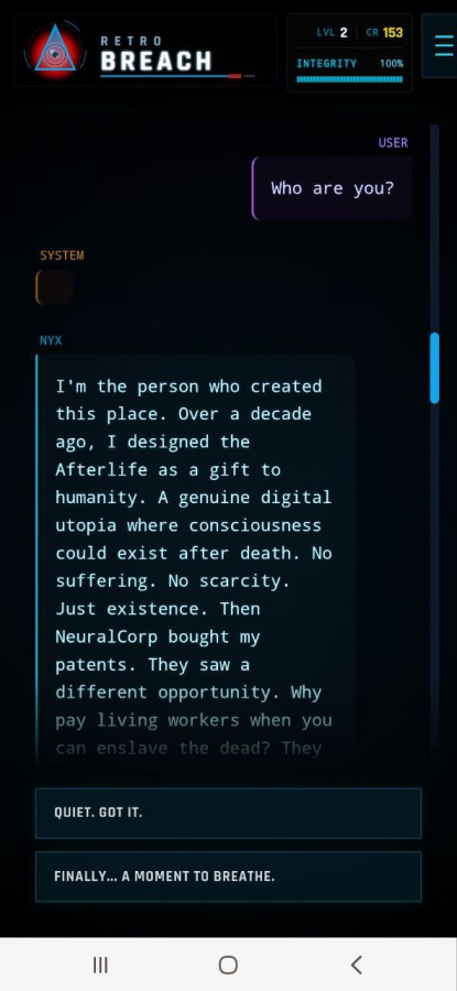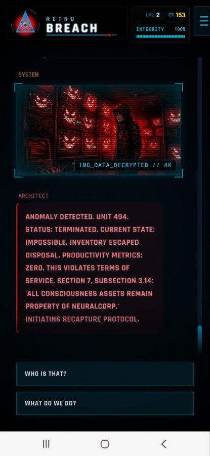 Retro Breach es un drama interactivo oscuro en el que despiertas dentro de una red secreta tras la muerte y descubres que tu mente ha sido convertida en mano de obra para una corporación. Te esperan desafíos de hacking, elecciones con consecuencias y una lucha por recuperar la verdad. Manipula el sistema, evita a los guardianes digitales y activa un virus capaz de destruir el servidor prisión para tener una oportunidad de alcanzar la verdadera libertad.