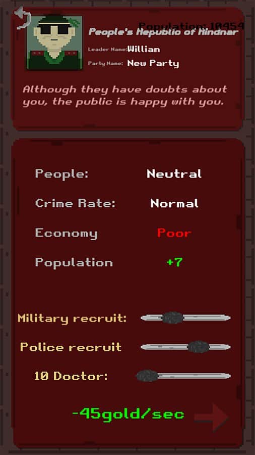 ¡Bienvenido al juego "República de Rindnar: Lucha por el Poder"! Jugarás el papel del jefe de la República de Rindnar y guiarás a tu país hacia la cima del orden global. Tu tarea principal es debilitar el Imperio de Rias y forzarlo a retirarse del continente. Tendrás que luchar en todos los frentes, desplegar tus ejércitos y crear tácticas para la victoria. Pero no olvides que el éxito depende no solo de la fuerza de tu ejército, sino también del estado de la economía y el nivel de criminalidad en la República. Para fortalecer tu país, necesitas desarrollar la economía, tomar medidas para reducir la criminalidad y garantizar la felicidad de la población. Cuanto más felices y satisfechos estén las personas, más impuestos podrás recaudar, lo que te permitirá invertir en mejorar tu ejército y hacerlo aún más fuerte.