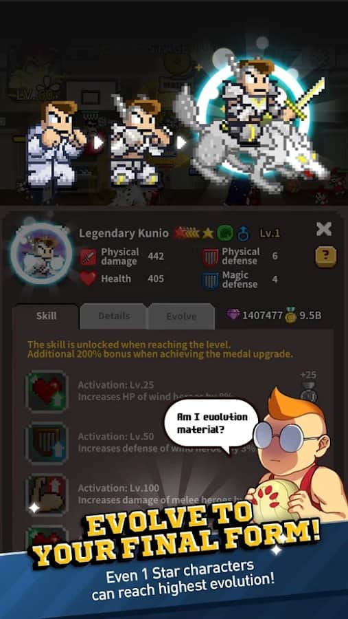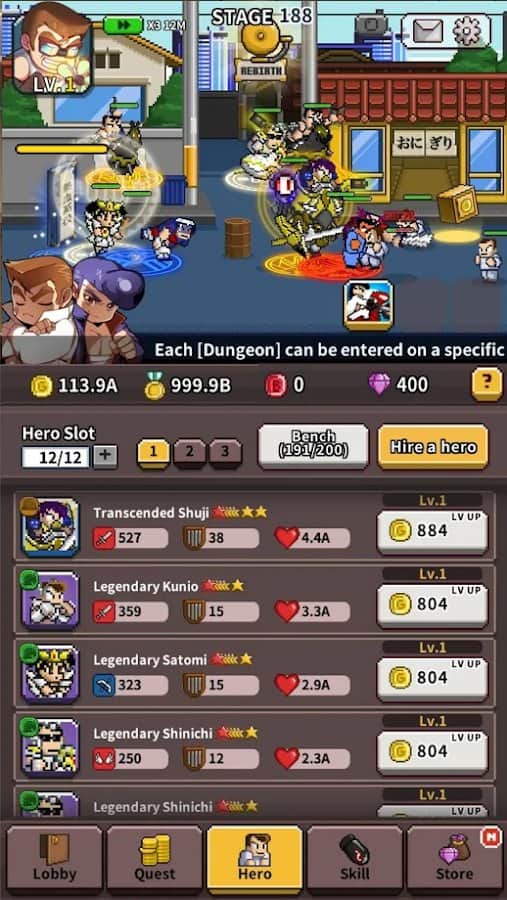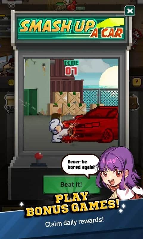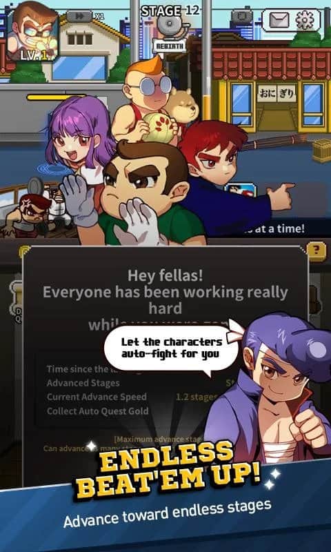 River City Ransom: Kunio Regresa – maneja a un valiente héroe, Kunio, que regresó a la escuela y descubrió que hay bandidos y villanos. Ayuda al personaje principal a reunir un equipo de valientes héroes y luchar contra enemigos. Toca la pantalla en el momento adecuado y desata devastadores golpes con manos y pies contra los enemigos. Guía a tu héroe en ubicaciones únicas y utiliza la función automática de combate. En el juego encontrarás más de 1000 etapas, habilidades de personajes únicas, logros y clasificaciones.