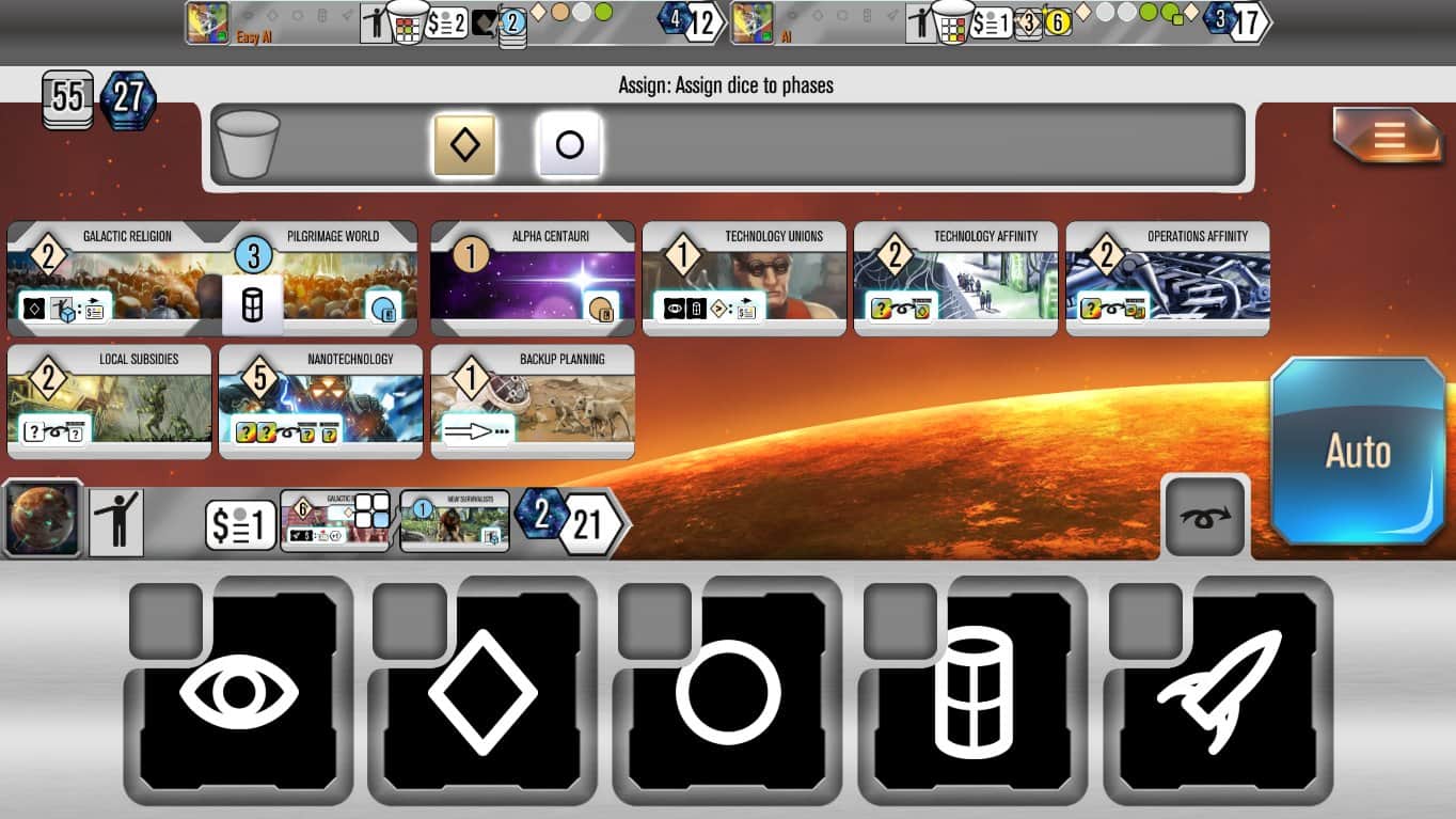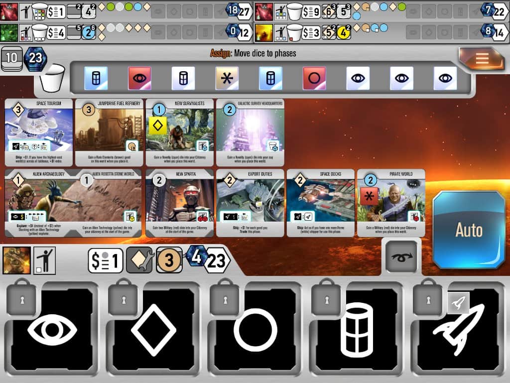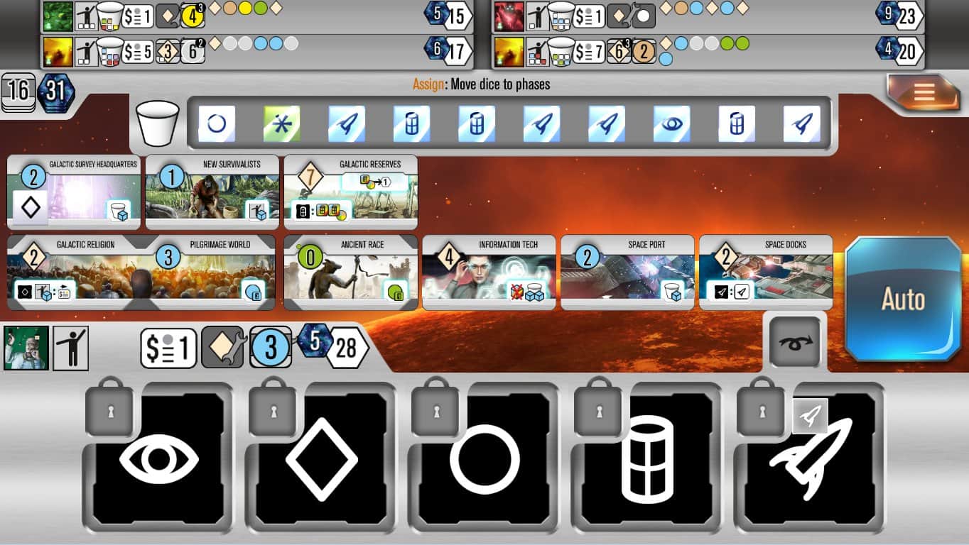 Lanza los dados en el juego de mesa Roll for the Galaxy, donde construyes imperios espaciales para 2-5 jugadores. En este juego representas a tu pueblo, que puede aspirar al desarrollo de nuevas tecnologías, el desarrollo de los mundos y la entrega de mercancías. El ganador es el jugador que mejor gestione a sus trabajadores y construya el imperio más próspero.