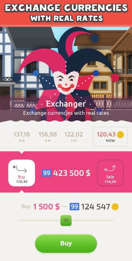 Monedas Reales – un clicker en Android, donde tienes que construir tu Reino y llevarlo a la prosperidad. Haz clic en la pantalla de tu dispositivo tanto como sea posible y obtén monedas que puedes intercambiar por una moneda global. Haz que su Reino sea rico y construye con el dinero. Erige edificios para diferentes propósitos y expande su Reino a proporciones obscenas. Conviértete en un gobernante sabio e intercambia su moneda por otra, considerando la tasa y obteniendo ganancias. Obtén ganancias en todas partes y haz comercio con amigos, aumentando así su fortuna. El juego cuenta con más de 60 edificios diferentes para distintos propósitos, más de 350 mejoras y la capacidad de jugar con amigos.