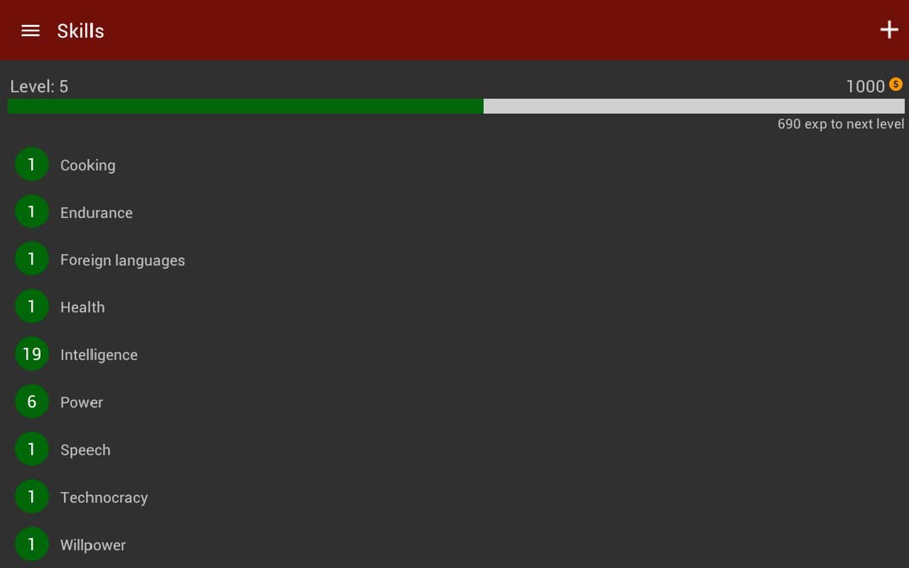 RPG En la vida real – Esta aplicación fue creada para el autodesarrollo y el control sobre sus acciones. Necesitarás realizar las tareas que tú mismo te has propuesto, o pueden ser aquellas que ya están en la aplicación. Cada vez que completes una tarea, marcarás así el aumento del nivel de ciertas habilidades, y el nivel general. La efectividad de la aplicación dependerá de cuán honesto seas al llevarlo a cabo.