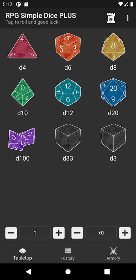& lt;p & gt;RPG Simple Dice es la aplicación de juego de dados más comúnmente utilizada para juegos de rol en mesa. Guarda tus tiradas para facilitar el juego, lanza el cubo un gran número de veces, añade un modificador especial, visualiza el historial de lanzamientos, lanza muchos cubos al mismo tiempo, explora cubos clásicos y personalizados. Personaliza la funcionalidad para ti, aunque parece bastante simple. Para empezar a usar la aplicación, no se requieren instrucciones en absoluto, todo es bastante claro y simple.