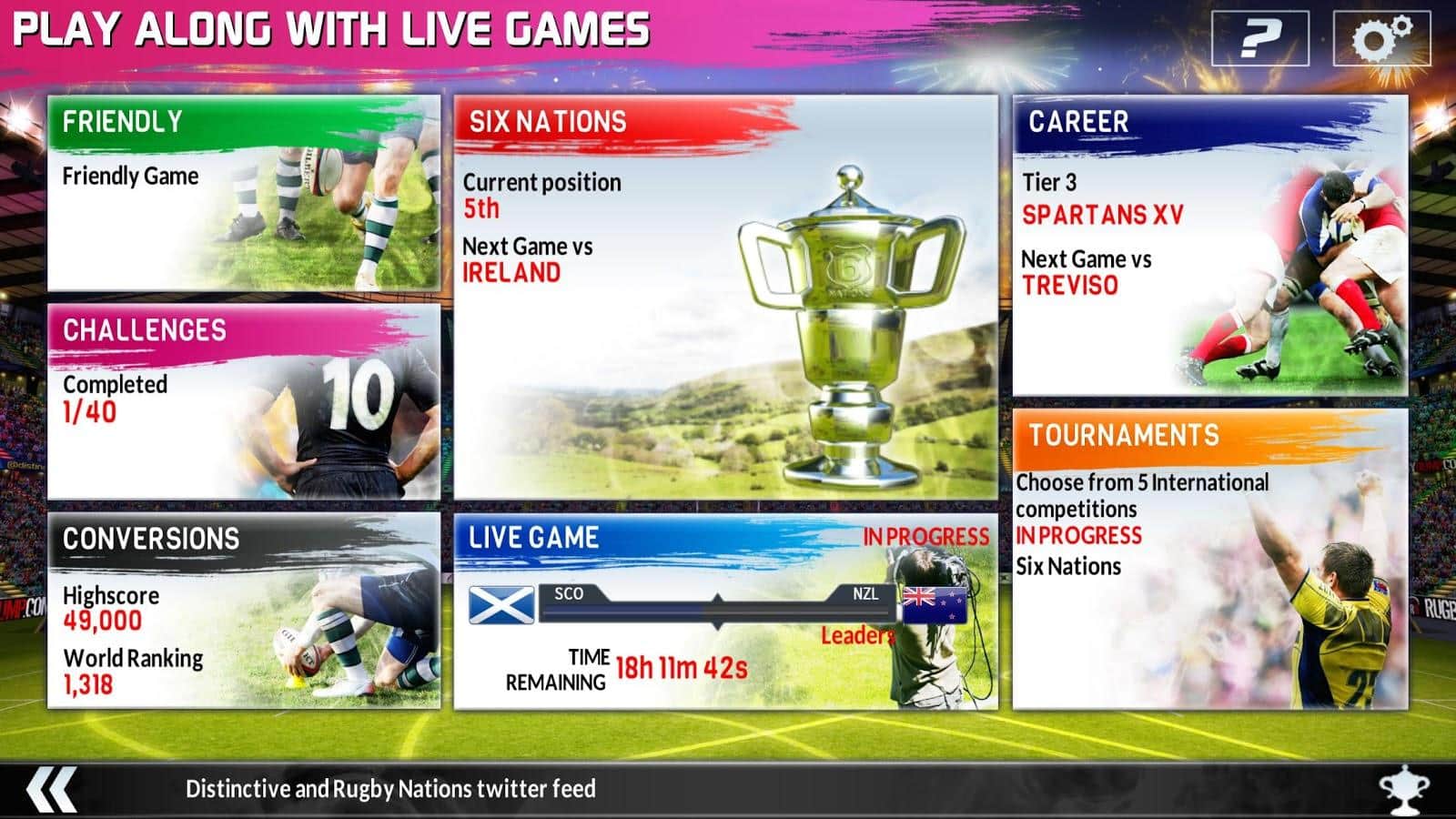 Rugby Nations 16 - un juego de rugby bastante realista. Excelente gráficos, varios modos de juego, así como la posibilidad de convertirte en el mejor equipo de esta temporada. En esta versión, se ha mejorado el control, que ahora es aún más amigable para el jugador. También se ha trabajado exhaustivamente en los gráficos y la animación de los movimientos de los jugadores. Los torneos que se llevan a cabo en el juego replican los torneos reales de rugby. 20 equipos calificados, pase a los playoffs y luego un poco más para convertirte en el campeón del torneo. El juego funciona igual de bien tanto en teléfonos como en tabletas. ¡Conviértete en una verdadera estrella del rugby!