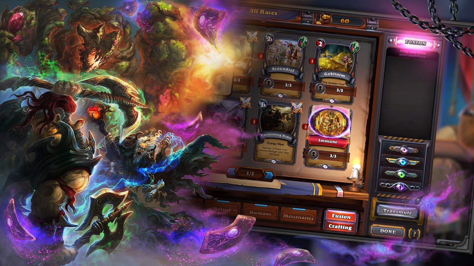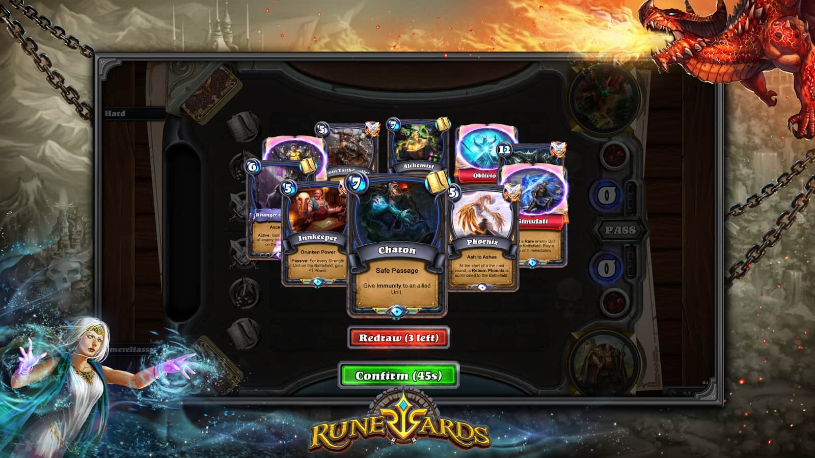 Runewards: Juego de cartas de estrategia - gran estrategia de cartas que te enseñará a pensar varios movimientos por adelantado. Y aunque muchos piensan que ya tienen sus favoritos en este género, incluso en este juego logró destacarse entre los demás. Su característica principal es que las partidas son mucho más cortas aquí, ¡pero el juego se juega a dos victorias! Esto le da a los jugadores la oportunidad de replantear su estrategia, y específicamente de perder la primera ronda para averiguar los planes de su oponente, o de jugar todas las cartas sobre la mesa y ganar de otra manera.