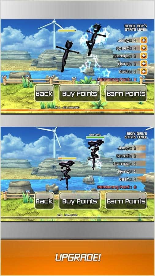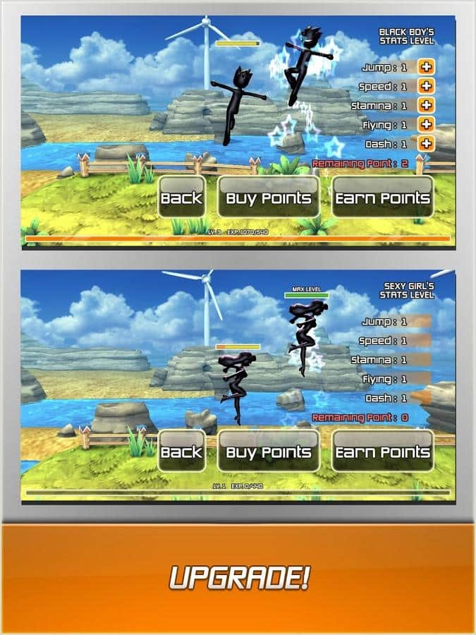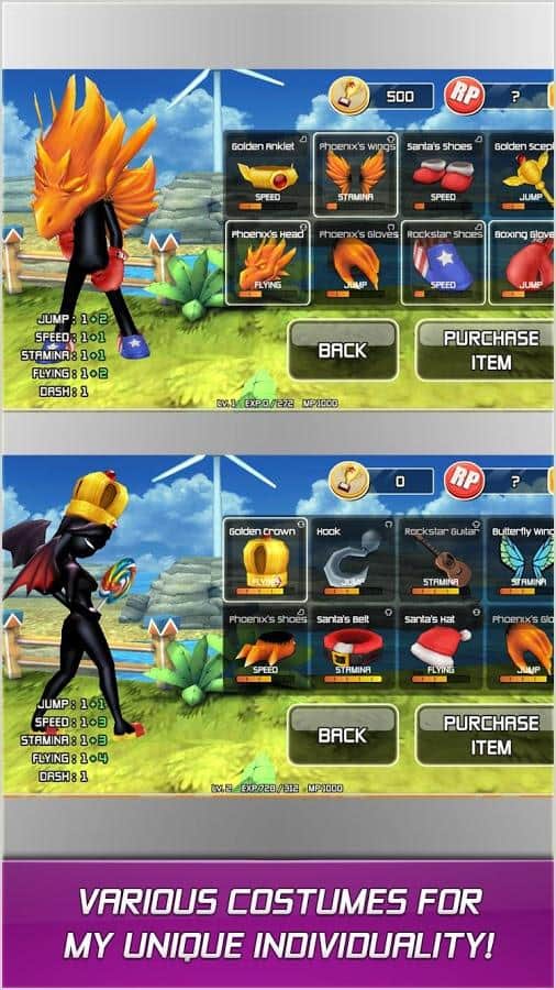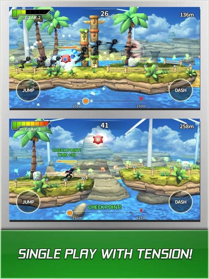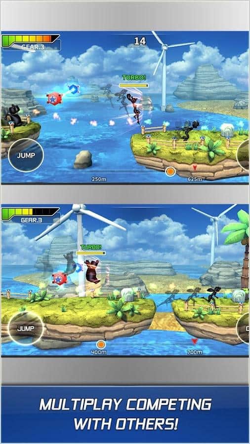 RUN'n'FLY – un plataforma en Android, con gráficos brillantes y la posibilidad de jugar en multijugador. Corre a gran velocidad por bosques tropicales y trata de no caer en el abismo. Juega con tus amigos y aumenta tus combos recogiendo rayos en el camino. Elige a tu héroe, cada uno tiene sus habilidades únicas, vuela y realiza saltos prolongados. Supera las paredes que se te presenten utilizando para ello un impulso y tus superpoderes. El juego te alegrará con un modo multijugador donde podrás jugar usando tu cuenta de Google. Juega y mejora las habilidades de tu héroe al máximo.