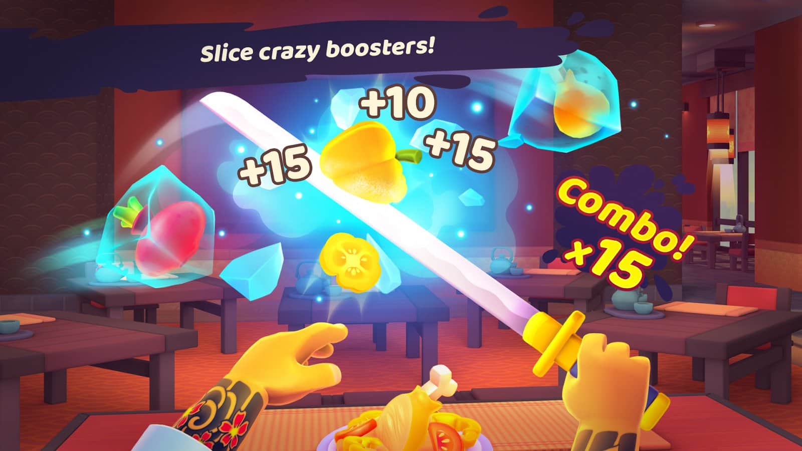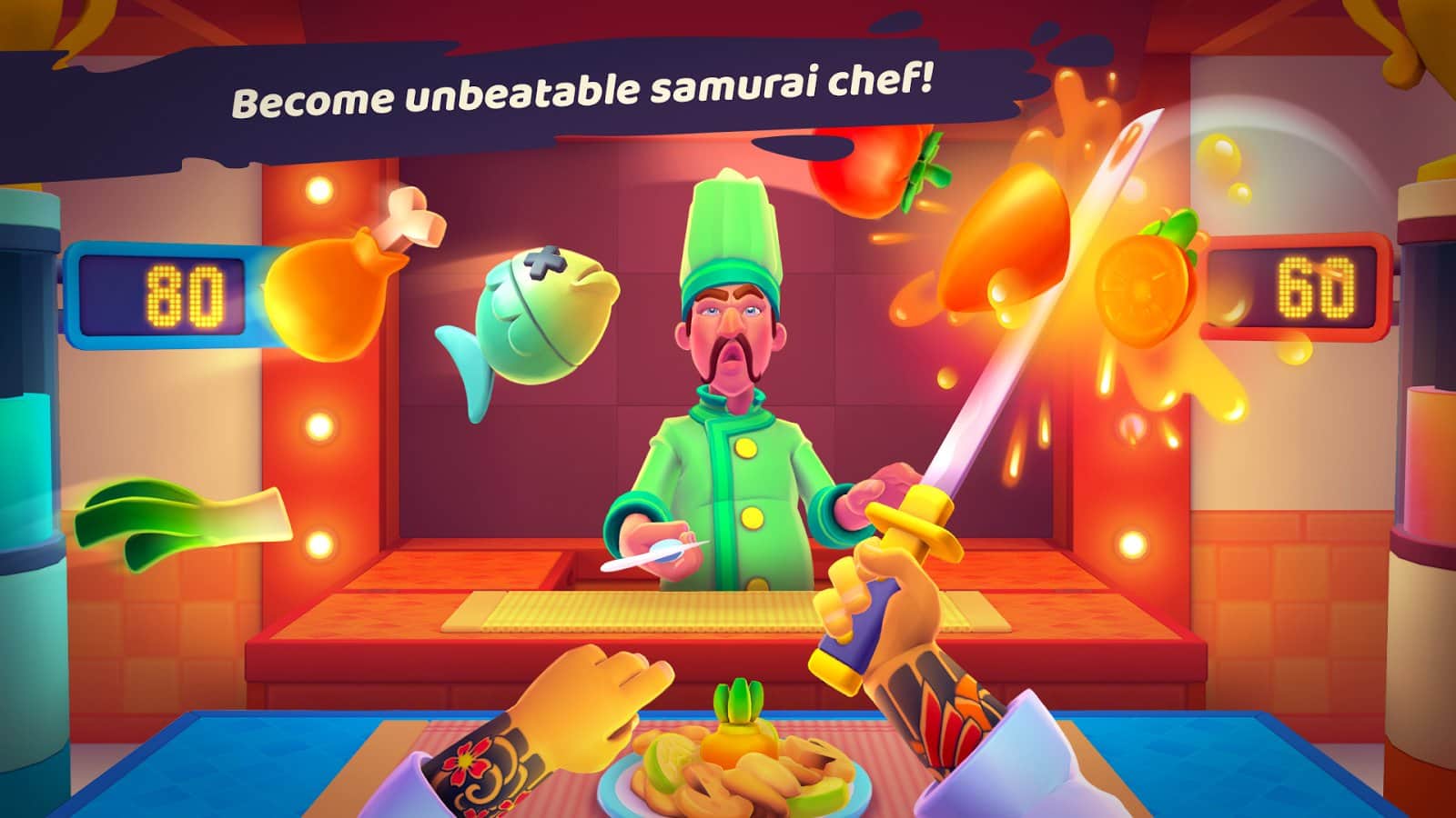 El juego de arcade de cocina llamado Fruit Ninja en su momento ganó una popularidad sin precedentes, y la mecánica de juego era muy simple, debes usar diferentes objetos de corte y picado para cortar los alimentos que vuelan. Los creadores del nuevo juego llamado Samurai Chef tomaron prestada la mecánica y en este caso presentaron el juego en un estilo contemporáneo. Debes jugar el papel del chef de un restaurante japonés y usar la espada para cortar en pedazos la comida voladora, también debemos señalar que la solución gráfica está hecha en gráficos tridimensionales utilizando colores brillantes y animaciones impresionantes, así como soporte para VR.