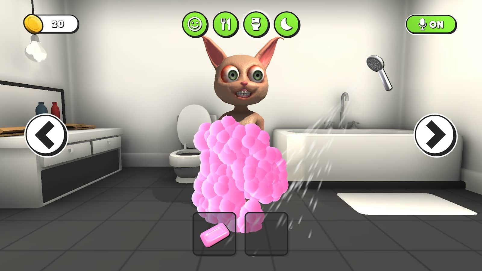 Ana aterradora - esta vez se nos ha dado una criatura bajo nuestra ala parental que parece un gato sphynx. Podemos tomarla por las manos y las patas y girarla por la habitación, así como realizar acciones típicas para juegos de este género: alimentar, bañar y poner a dormir. Se incluyen mini-juegos: hay una cierta cantidad de ellos que a tu gato también le gustarán. Sin embargo, no es tan simple. La comida puede ser venenosa, lo que puede afectar a nuestra mascota, y cuando duerme, vuela por encima del suelo. También puede repetir lo que dices.