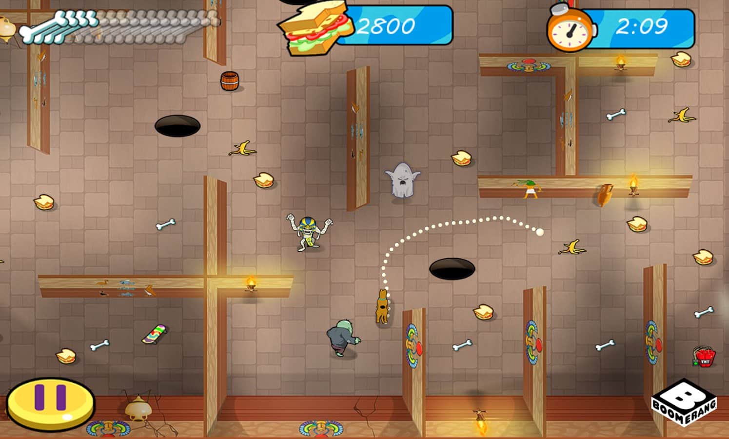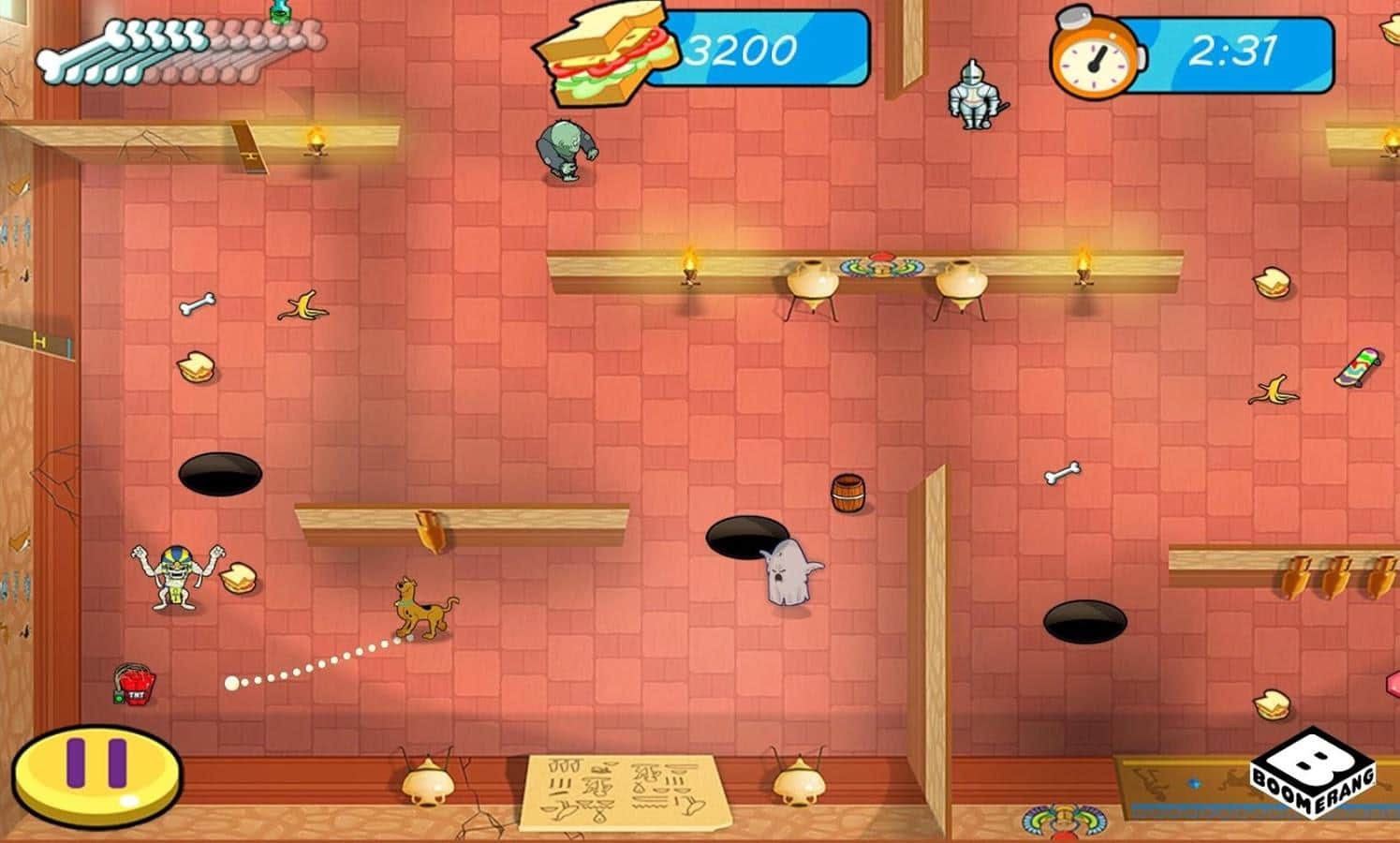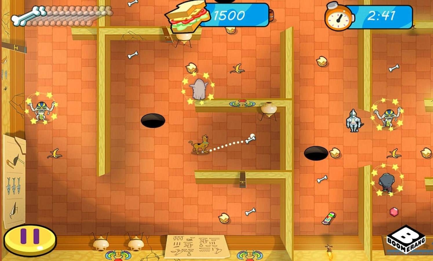 Scooby Doo: ¡Te amamos! - juego de rompecabezas de arcade basado en la famosa serie, la historia comienza a desarrollarse después de que tu fiel amigo Shaggy se encuentra atrapado en una terrible tumba, y tu tarea ahora es ayudarlo. Cada nivel del juego es un laberinto intrincado lleno de trampas y monstruos, tu tarea es abrir el camino para Scubby para que llegue a tu amigo evitando todas las trampas y no encontrándose con zombis, momias, vampiros y otros habitantes de la tumba.