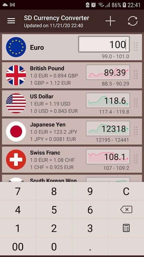 La aplicación SD Convertidor de Divisas te permitirá no solo conocer las tasas de cambio actuales, sino también calcular el monto de una tarifa, traducir una moneda a otra en modo offline. Aquí se han recopilado más de 450 tipos de divisas, incluidas criptomonedas y metales. Gráfico de tasas integrado, varias fuentes verificadas, añade favoritos a la pantalla principal, listas ordenadas, conversión automática especificando el precio, selección de la tasa cruzada, gestos, actualizaciones regulares y otras características te ayudarán a gestionar cuentas de manera conveniente, rápida y fácil, y a estar al tanto de los nuevos cambios en el mercado de divisas.