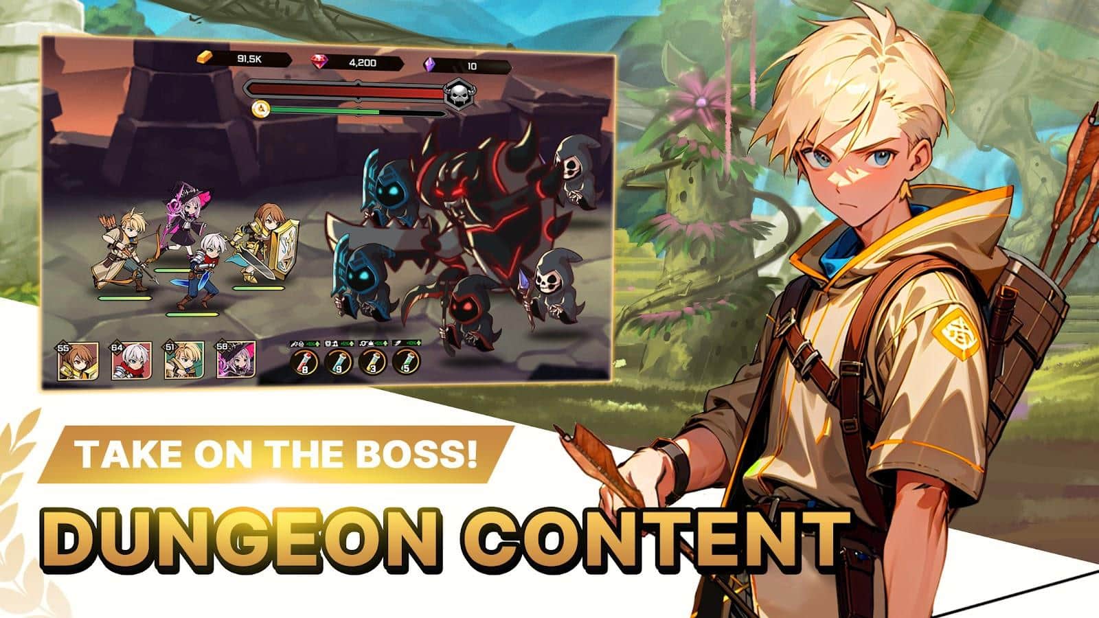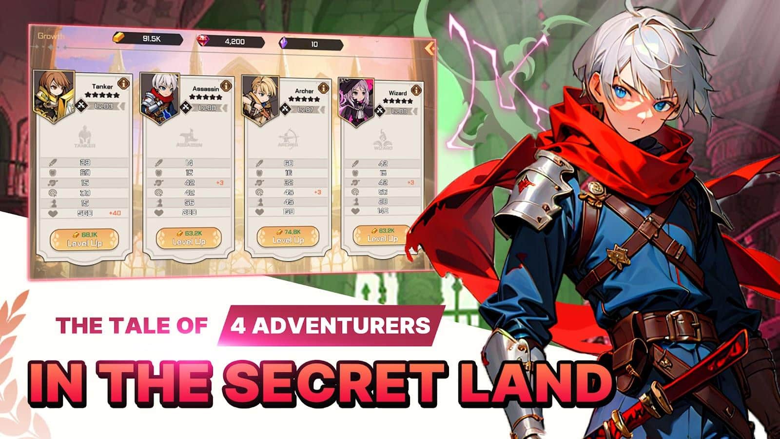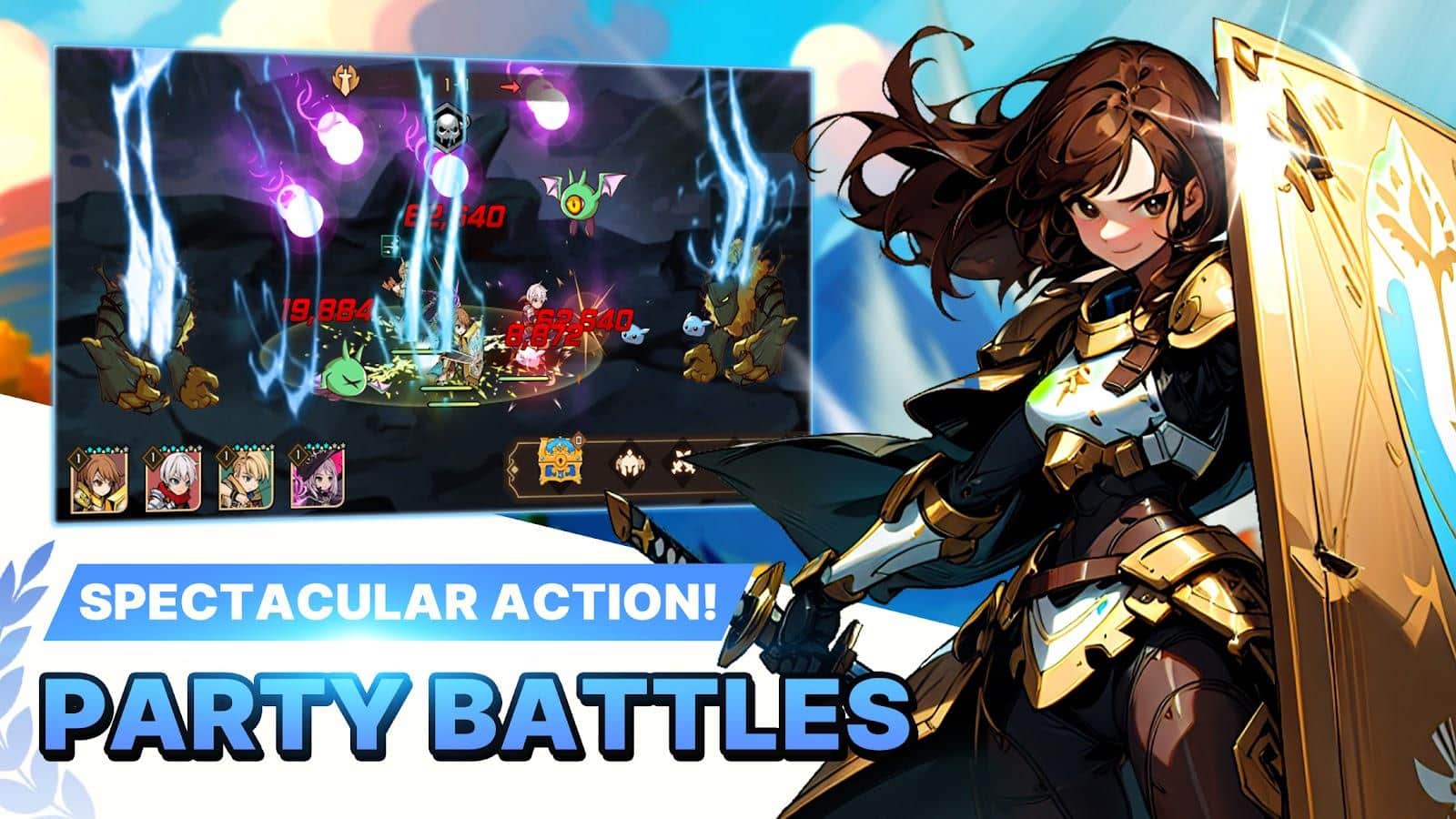 Aventura en la Tierra Secreta - En una zona lejana y inexplorada, se ha descubierto un nuevo continente, atrayendo a aventureros con grandes sueños. Vamos directamente al punto caliente de este Nuevo Mundo. Crea un poderoso equipo de 4 personajes con diferentes clases. ¡Las aventuras se convertirán en una verdadera fiesta! Cada personaje tiene habilidades únicas, devastadoras con un solo golpe. ¡Tu equipo se vuelve increíblemente fuerte!