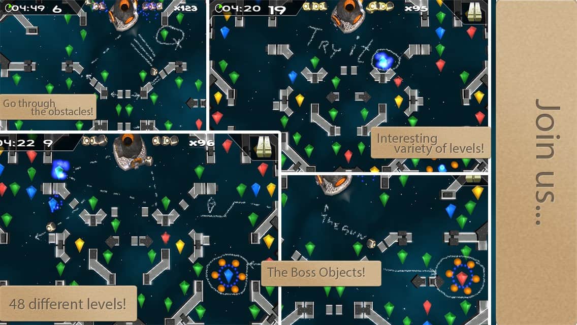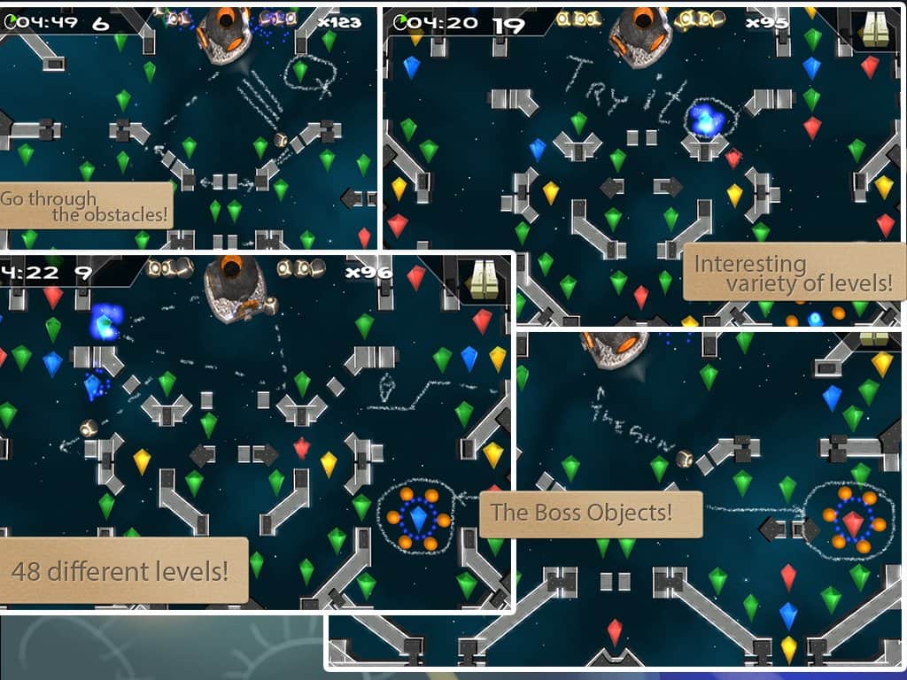 El juego es interesante y entretenido. Es simple: elige el cañón, determina la dirección y el objetivo, ¡y Bang! Las cargas ya están volando para destruir el siguiente cristal y liberar su energía. El objetivo es simple: golpear tantos cristales como sea posible con cada bola. Recuerda, no todos los cristales son iguales. Verde: el más simple y frágil. ¡Cualquier contacto y el cristal se rompe! Los cristales rojos son fácilmente destruidos por cargas rojas, azules - azules, y si al contrario, tendrás que dispararles. Los cristales dorados - ¡eso es una verdadera riqueza, por cuya razón vale la pena vivir! ¡Un golpe y te conviertes en el dueño de una enorme cantidad de energía! Pero estos cristales están escondidos en un laberinto de paredes o rodeados de muchos otros cristales, a través de los cuales romper es muy difícil. Pero los cristales alrededor de los cuales gira la esfera protectora son realmente un hueso duro de roer, ¡una verdadera fortaleza voladora! Intenta derribarlos rápidamente, o las áreas de protección se restaurarán. Aprender a jugar es muy fácil, pero ganar no es fácil. Incluso si no todos lo logran la primera vez, conseguir una estrella no es fácil: para esto necesitas acumular un mínimo de puntos de energía. Y después, si aún quieres ser el mejor, puedes salir a cazar una vez más y entonces el premio principal seguramente será para ti!