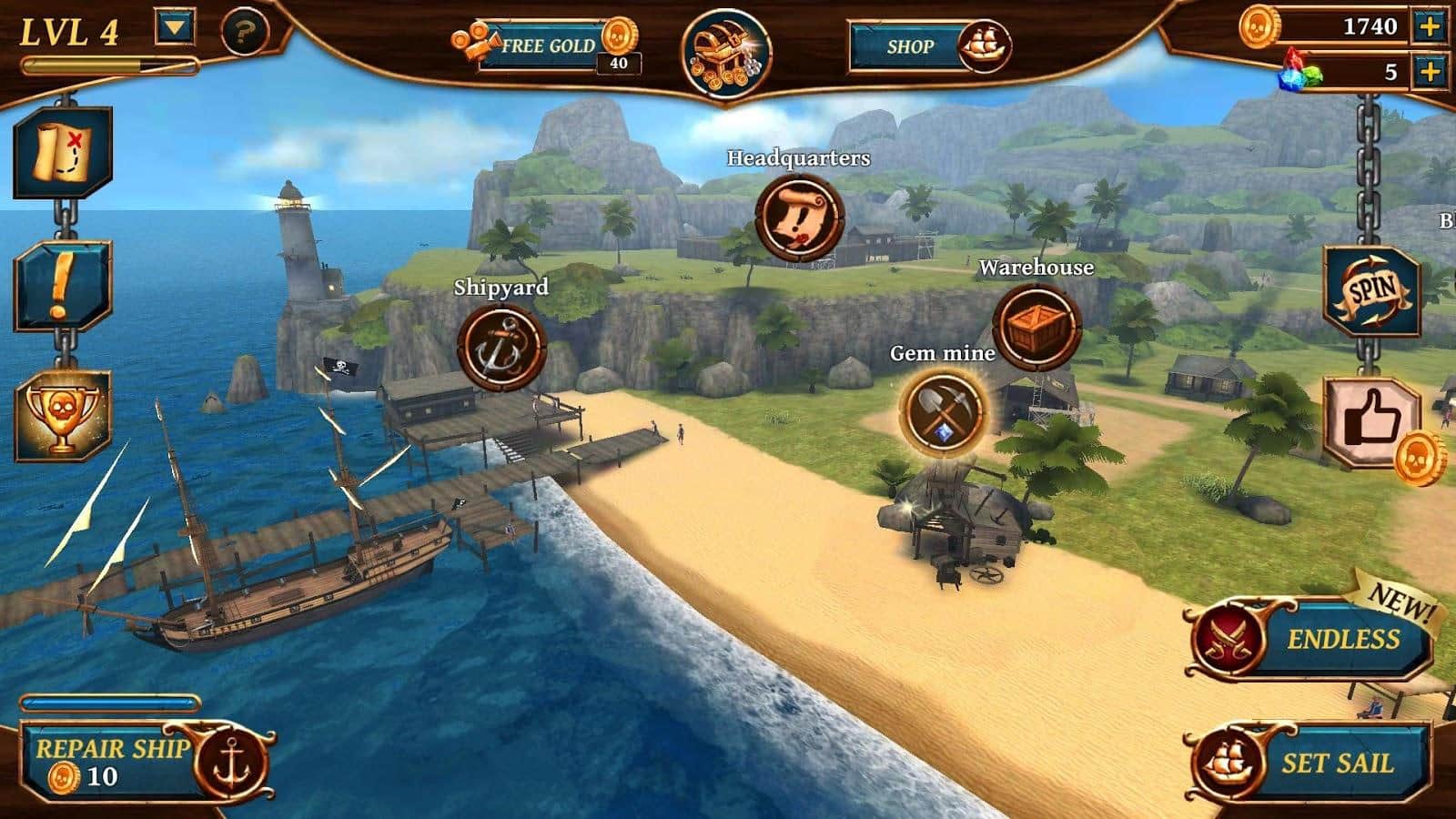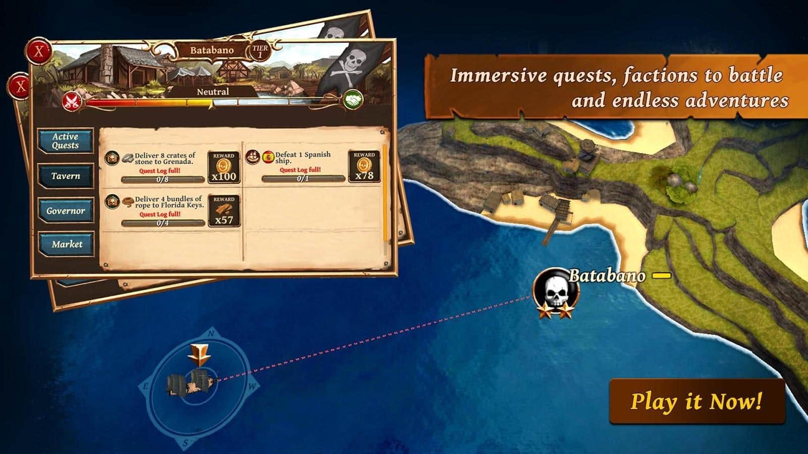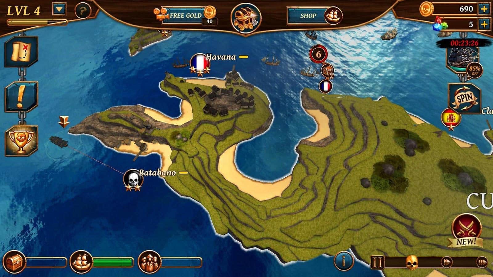 Barcos de Batalla Edad de Piratas – estrategia para Android, que te lleva al siglo XVIII, donde navegarás un barco. En este juego te convertirás en capitán de un barco pirata y navegarás por las vastas aguas del mar Caribe, buscando tesoros y aventuras. Acepta tu parte en las batallas navales y derrota a oponentes experimentados, convirtiéndote en el pirata más famoso. Busca en el mapa nuevas áreas e islas y nada hacia ellas. Desarrolla tu isla construyendo varios edificios, mejorando tus vehículos y añadiendo una nueva flota. Participa en batallas navales con múltiples oponentes y hunde sus barcos. Solo en el juego se representan más de 15 barcos, y podrás comprobarlo en la práctica.