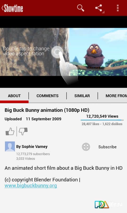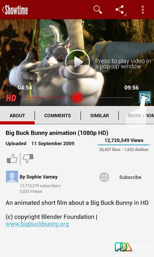 Showtime – excelente cliente de Youtube con muchas características para el desarrollador de Android de Mata. Mira cualquier video en la ventana emergente, cuyo tamaño se puede configurar desde 144p hasta 1080p. Rápido, eficiente y conveniente. Visualización agradable.