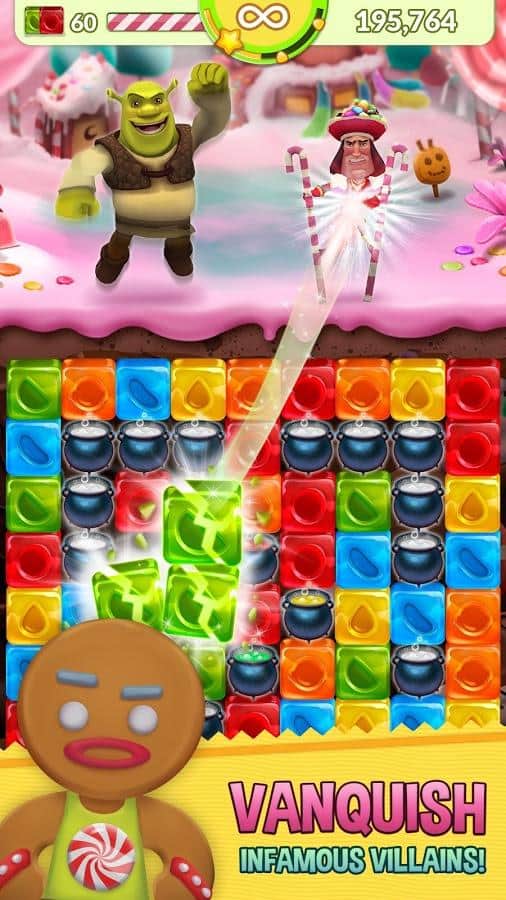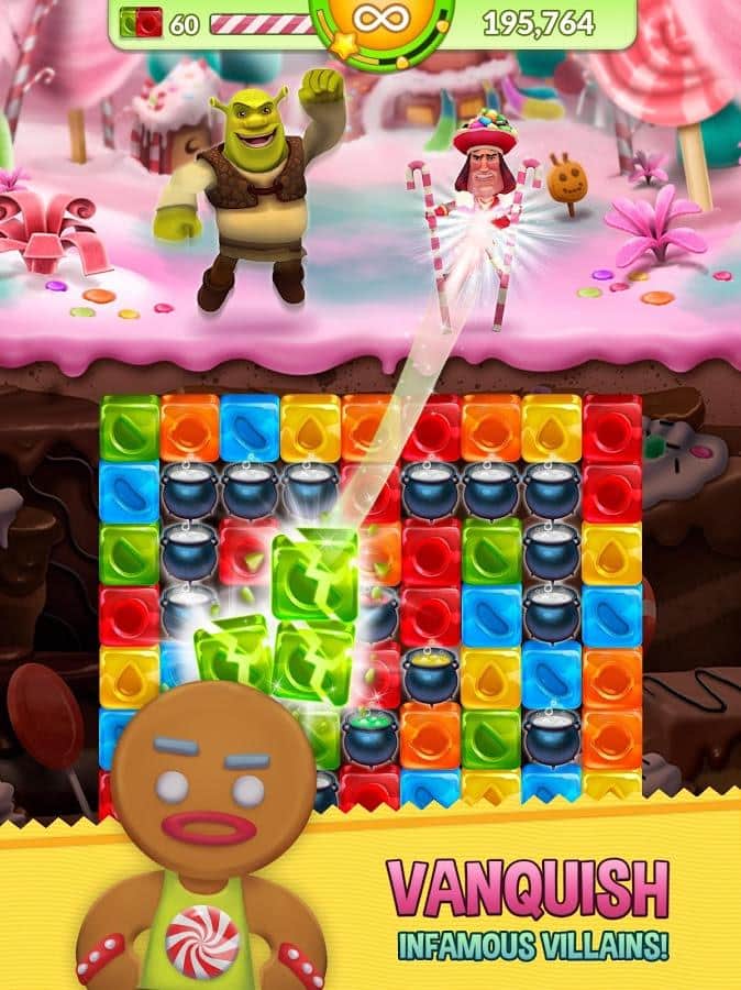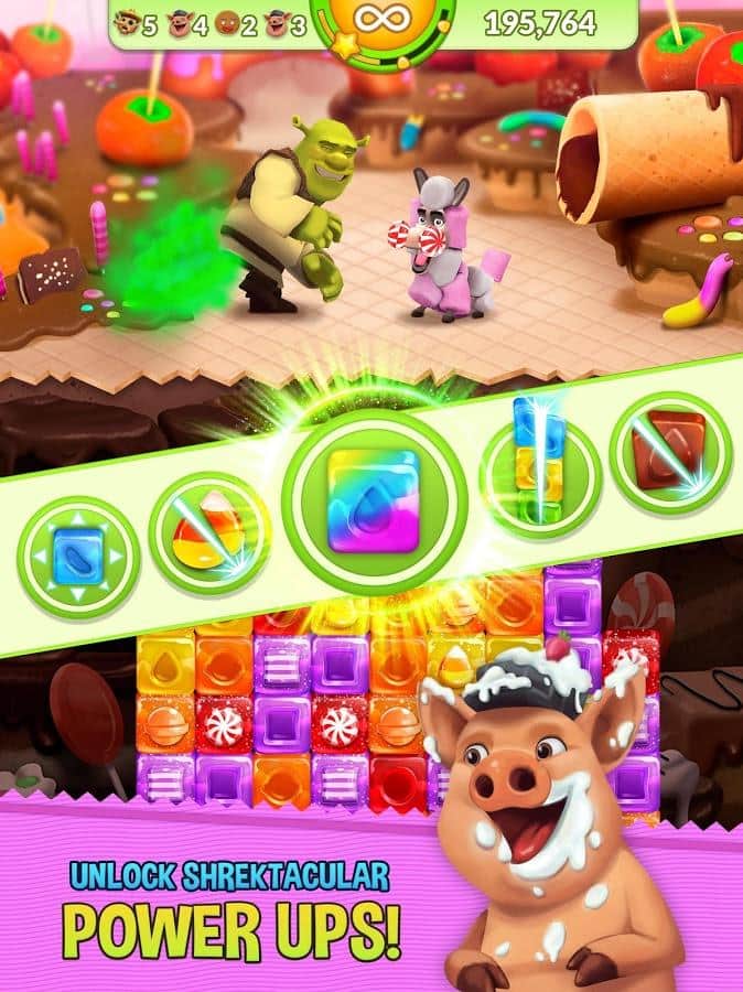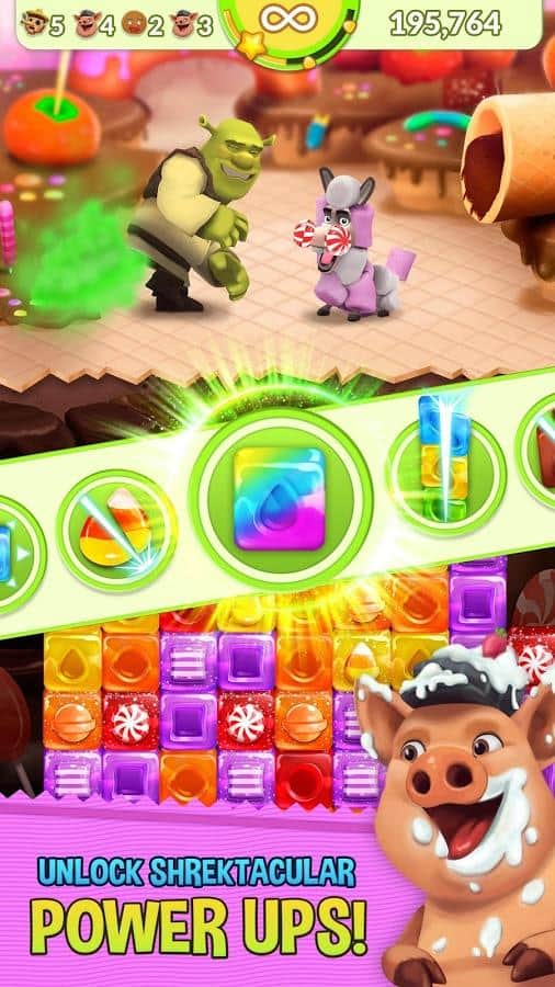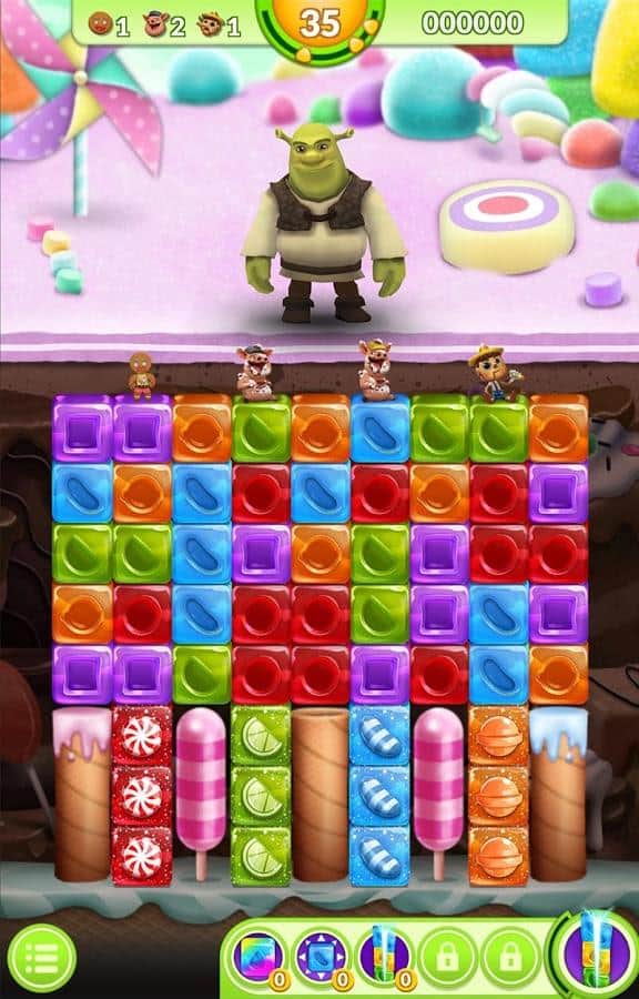 Shrek Fiebre de Azúcar - el clásico juego de arcade de rompecabezas basado en una de las franquicias animadas más populares. No es difícil adivinar por el título que hablamos del sombrío orco llamado Shrek. La trama del juego nos llevará al reino de los cuentos de hadas en el que ocurrió un evento sin precedentes, todo el mundo estaba dominado por fenómenos extraños que lo cubrían todo y toda la variedad de dulces, incluyendo el pantano favorito de nuestro héroe. Por supuesto, todo esto no pudo pasar desapercibido y Shrek, sin dudarlo, comenzó a recuperar su pantano del fenómeno pegajoso. La mecánica del juego Shrek Fiebre de Azúcar se basa en un esquema clásico, combina los mismos elementos de tres o más, para así salvar a sus amigos y consumir dulces.