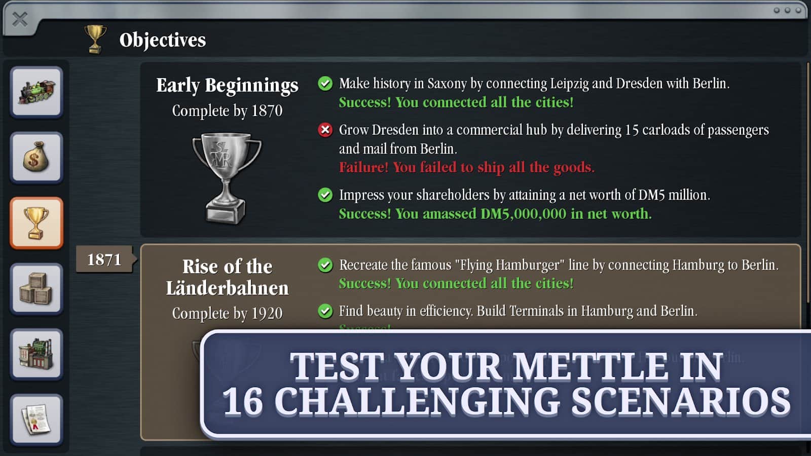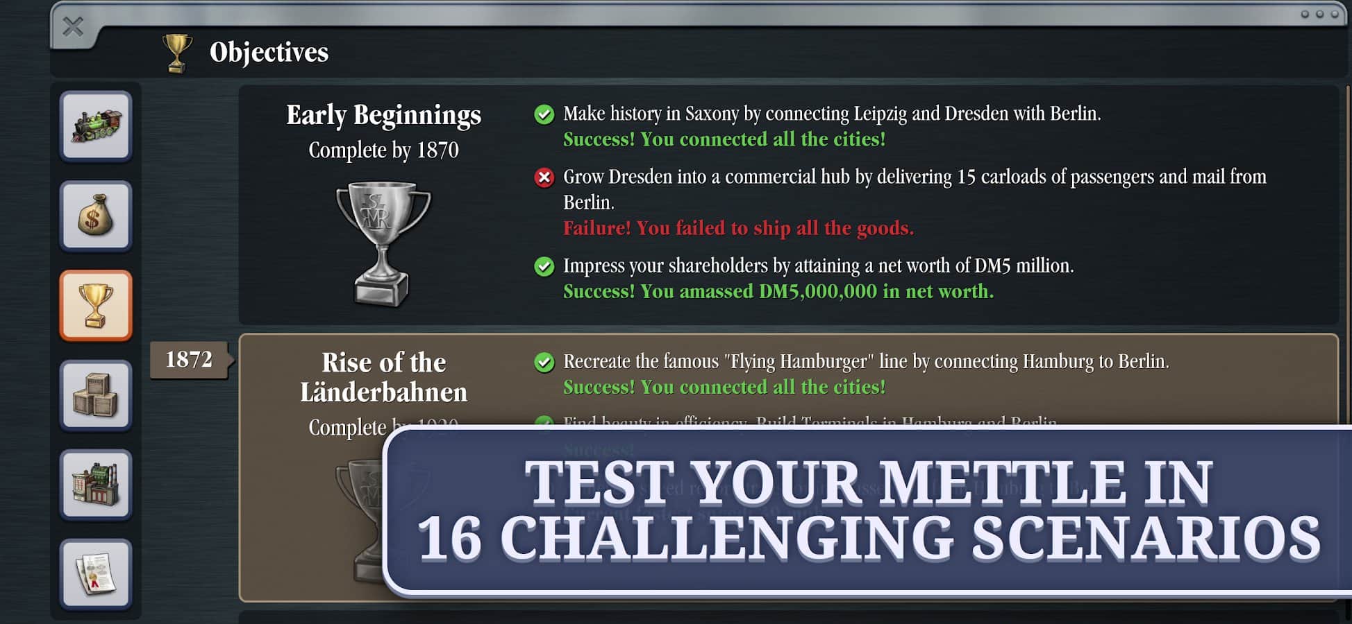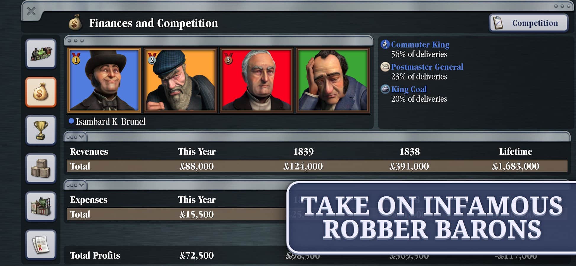 ¡Sid Meier's Railroads! - Crea y gestiona independientemente imperios ferroviarios diseñando nuevas rutas, construyendo estaciones, comprando y mejorando trenes, así como gestionando negocios y compitiendo con otros jugadores! Optimiza tus rutas para entregar carga más rápido y a un menor costo, y conviértete en el magnate ferroviario más exitoso del mundo. El juego tiene varios niveles de dificultad, así como la capacidad de jugar con amigos en modo multijugador. Viaja a través de toda una época, comenzando con las primeras locomotoras de vapor y terminando con trenes modernos de alta velocidad.