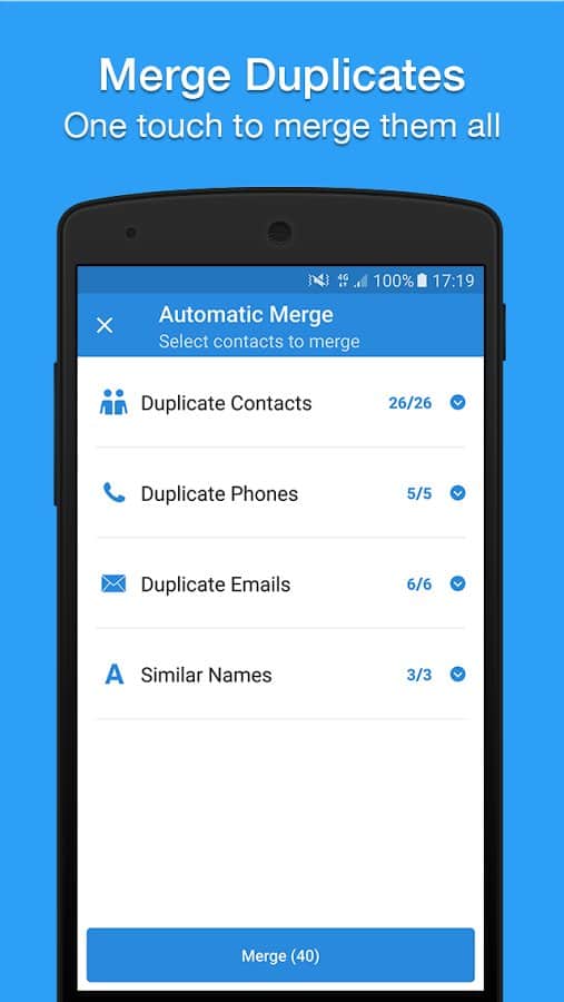 La capacidad de fusionar todos los contactos duplicados