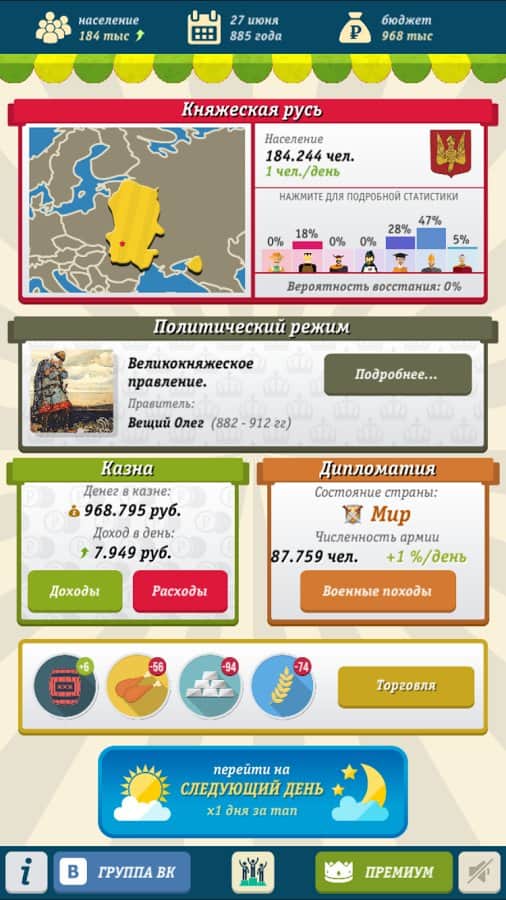 Simulador Rusia / Simulador Ruso - En este juego comenzarás a jugar desde el año 862. Este año, el destino de Rusia estará en tus manos. En el juego tendrás que establecer relaciones políticas, comerciar, subir o bajar la tasa impositiva para su población, y por supuesto, entrar en guerra por territorio. Muy a menudo tendrás que tomar decisiones que afectarán el desarrollo de Rusia.