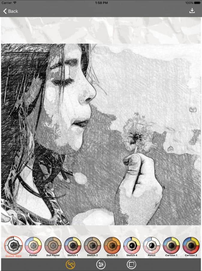 De alguna manera, para diversificar la abundancia de fotos similares en las redes sociales, puedes utilizar aplicaciones que convertirán tu imagen en un boceto a lápiz. Para mejorarlo, ayudará ajustar el brillo, el contraste y la saturación, así como un conjunto de efectos especiales: diferentes tipos de sombreado (trazos negros o blancos, boceto a color o a lápiz, etc.), sellos, difuminar bordes, etc.