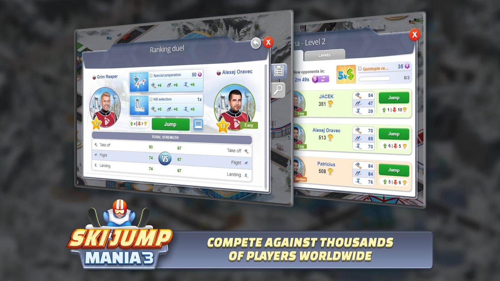 Juego de deportes Ski Jump Mania 3 en Android donde jugarás el papel de un esquiador saltando desde un trampolín. Acepta tu parte en varios campeonatos celebrados en diferentes partes del mundo y ocupa un lugar destacado, mostrando los mejores resultados. Construye tu carrera en deportes de invierno y conviértete en el campeón mundial en salto de esquí desde un trampolín. Prepárate para el descenso con diferentes saltos y evita que el atleta se caiga. Obtén premios y medallas por victorias en competiciones y compra ropa y esquís modernos y de alta calidad.