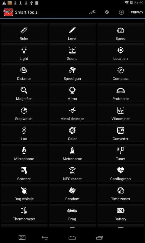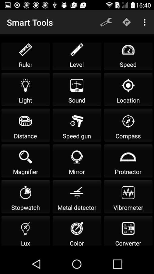 Herramientas Inteligentes - Muchas herramientas en una aplicación, hay casi todo para todas las ocasiones. Desde una linterna hasta un navegador, todo está perfectamente equipado y separado. Todos los dispositivos cumplen perfectamente sus funciones y funcionan utilizando tu smartphone. También vale la pena señalar que soportan múltiples formatos de cálculos, los datos y tantos idiomas, lo que simplifica enormemente el trabajo con la aplicación.